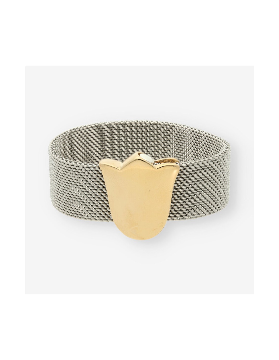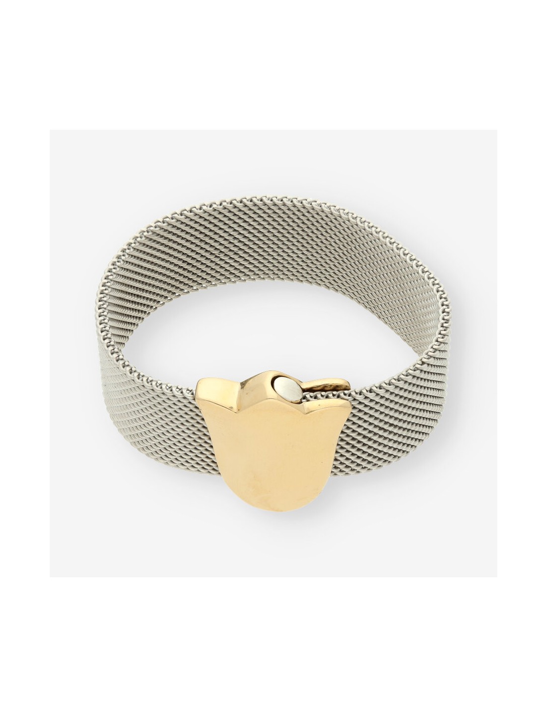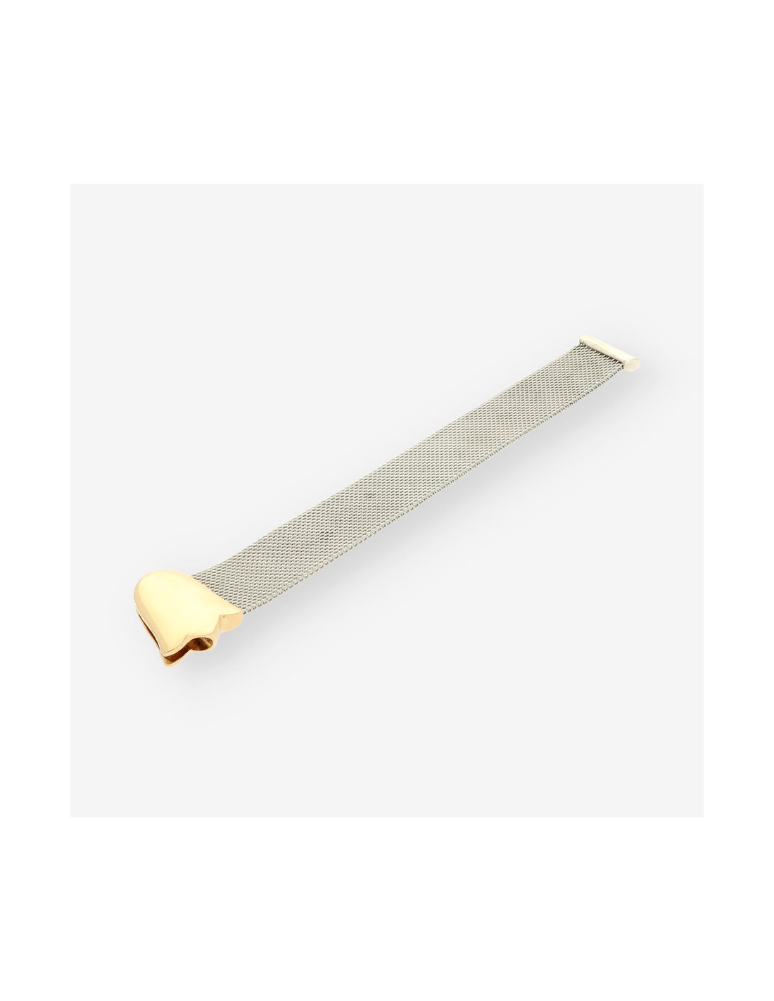 Preciosa pulsera Tous de segunda mano en malla de acero y oro amarillo de primera ley con la icónica figura de la gran firma. Una pieza indispensable para aquellos amantes de Tous. Largo: 19cm. Peso: 43.3gr.
