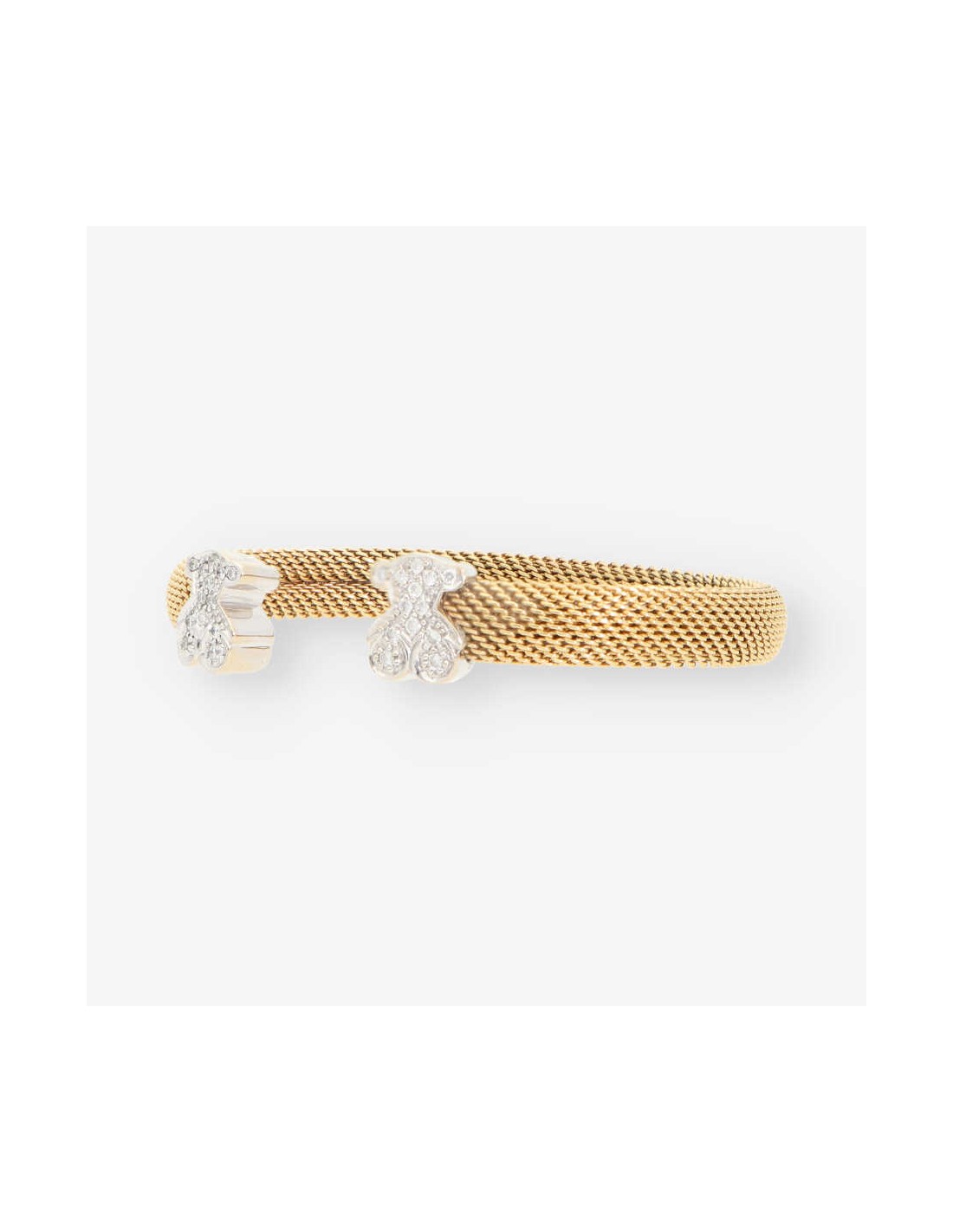Magnifica pulsera Tous en oro de segunda mano en oro amarillo y blanco de primera ley con un precioso acabado en oso con brillantes en los dos extremos de la pieza. Ancho: 6cm. Peso: 29.56gr.