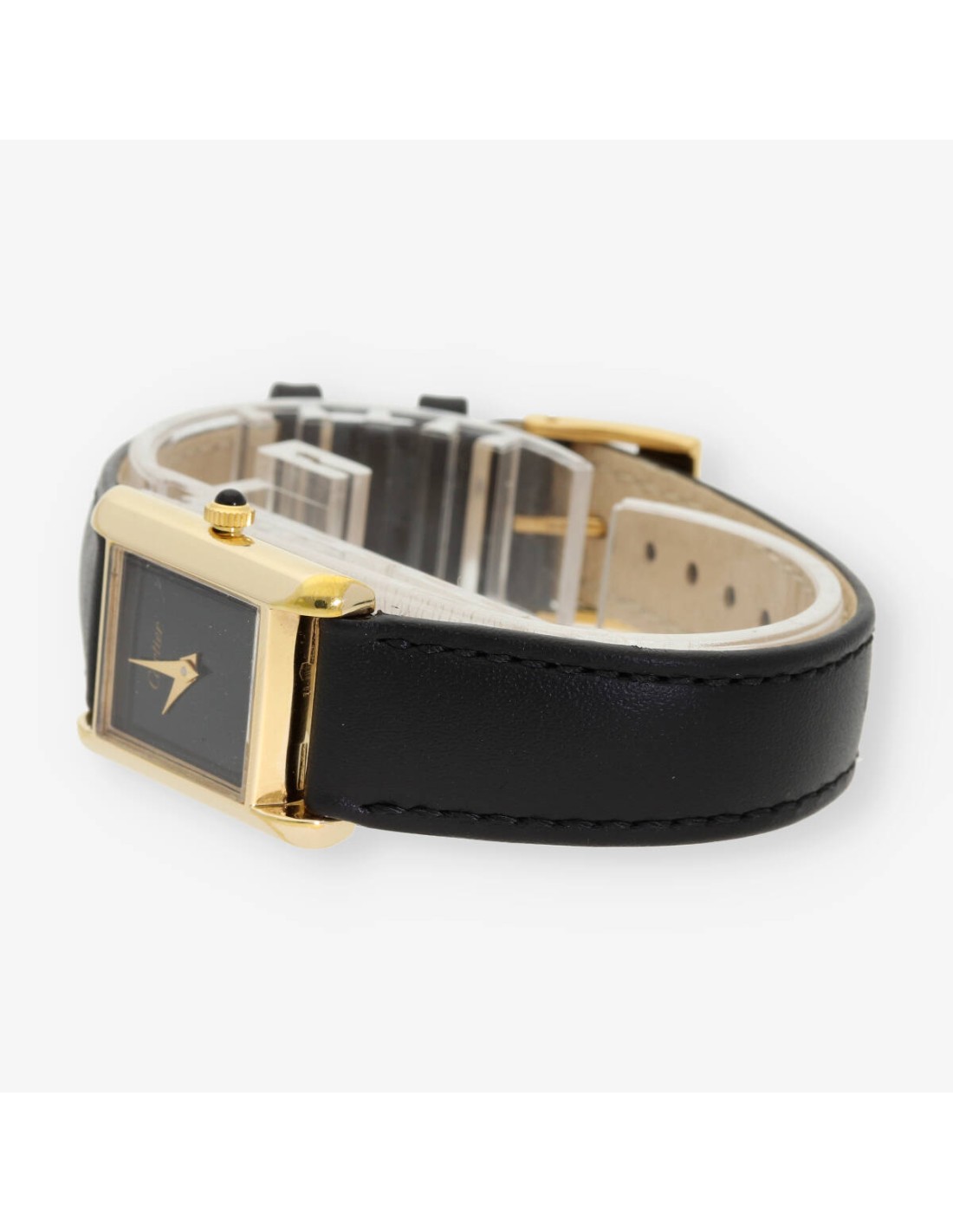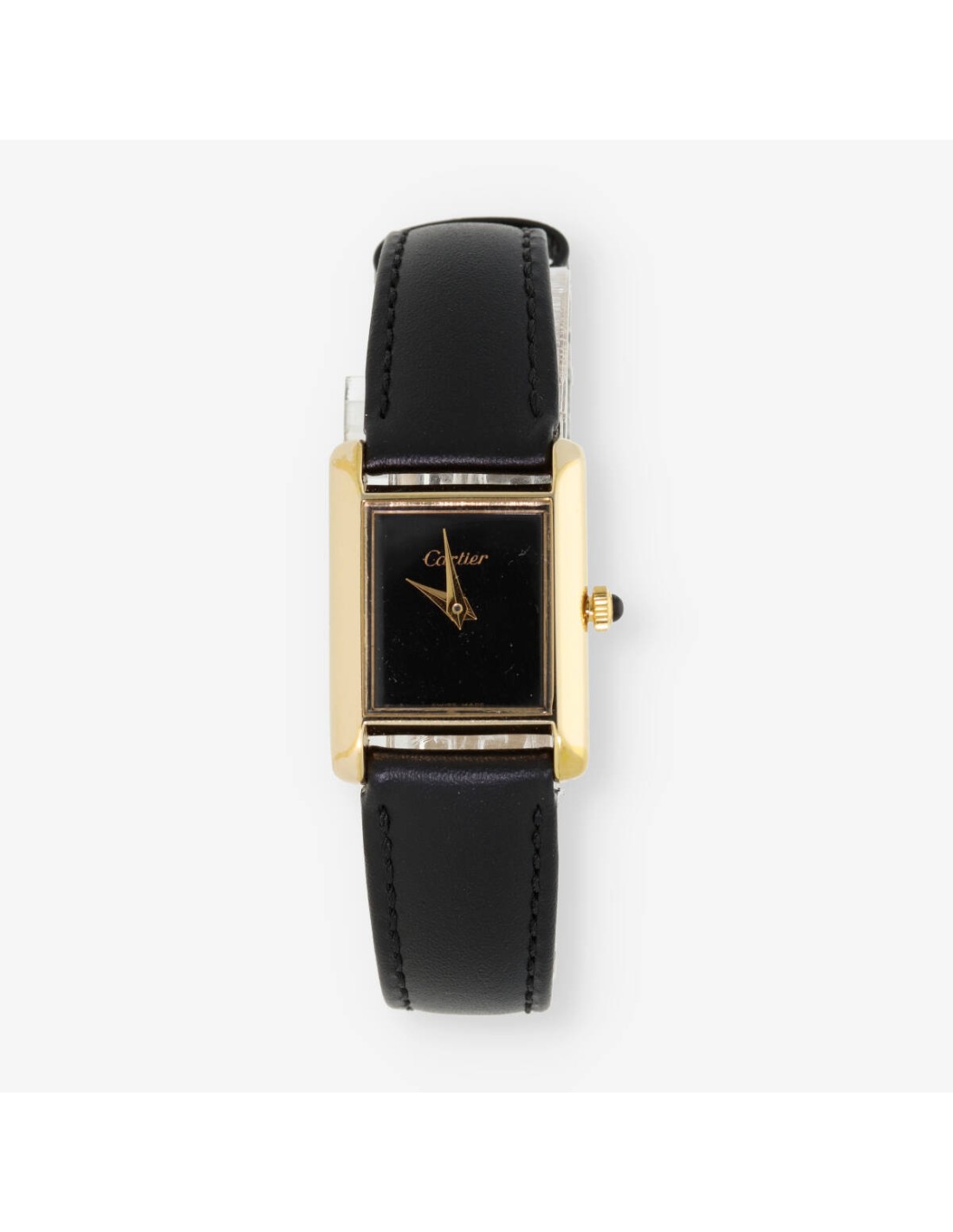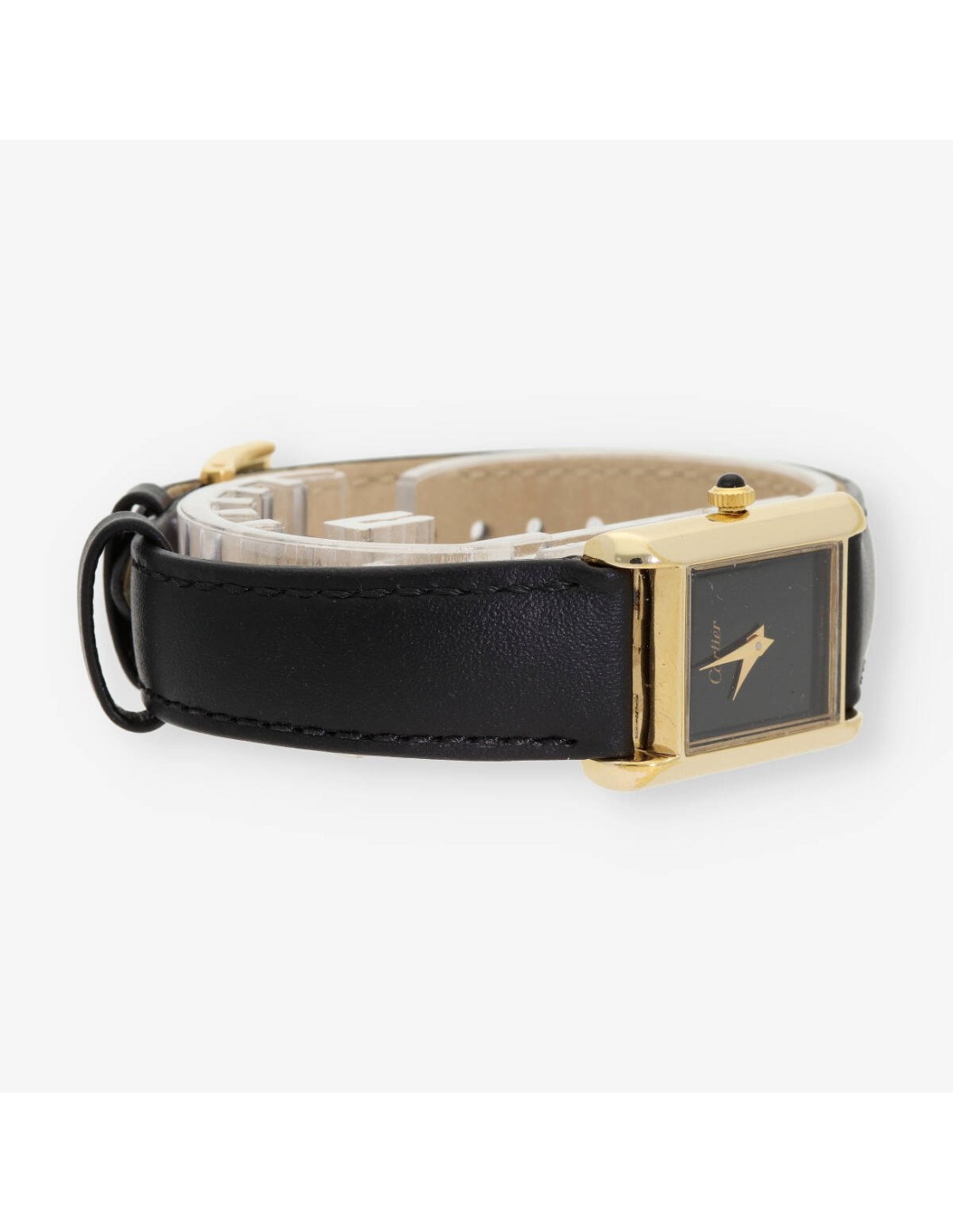 Magnifico Reloj Cartier de segunda mano con electro plaque de oro 18kt. Caja de 20x26 mm. Cuerda automática con cristal zafiro, fondo negro y sin números. Correa de piel negro.