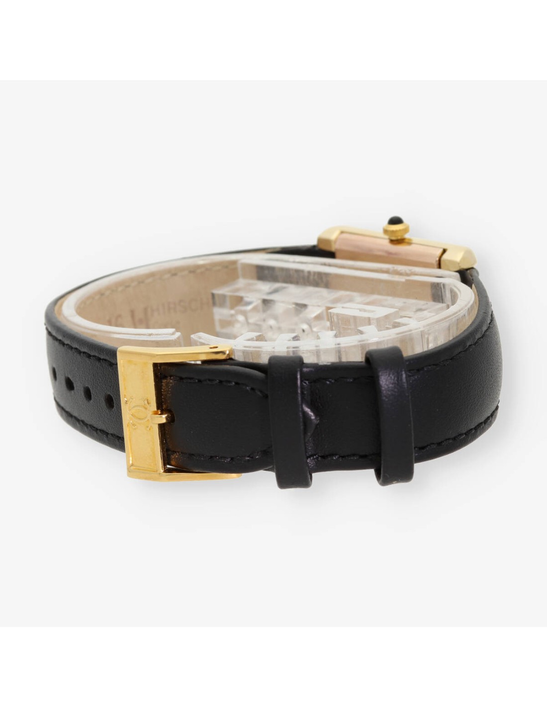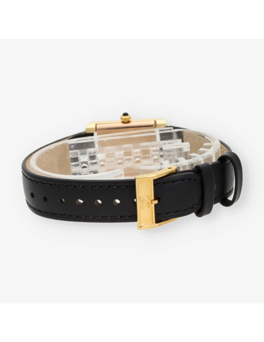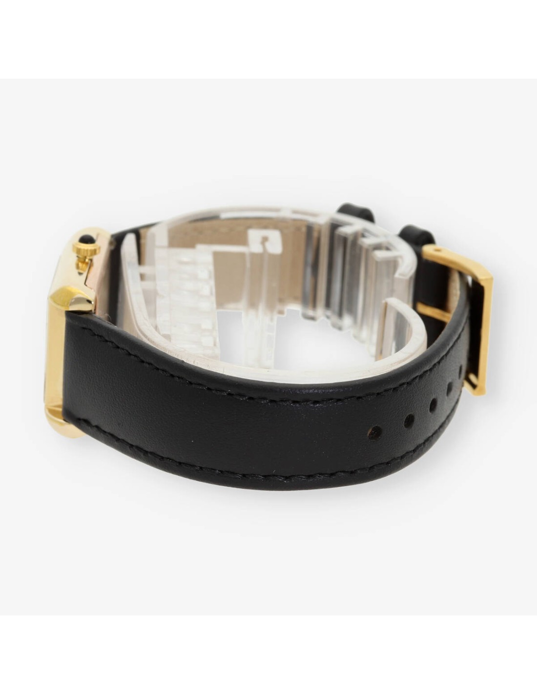 Magnifico Reloj Cartier de segunda mano con electro plaque de oro 18kt. Caja de 20x26 mm. Cuerda automática con cristal zafiro, fondo negro y sin números. Correa de piel negro.