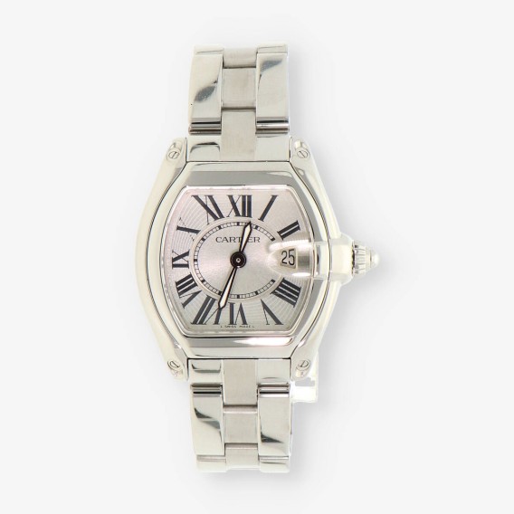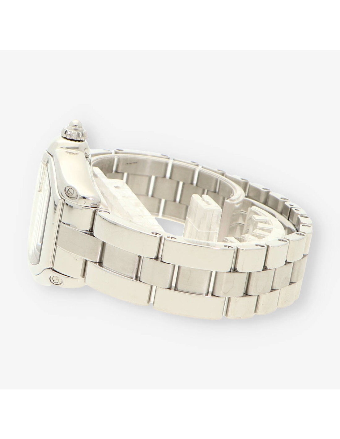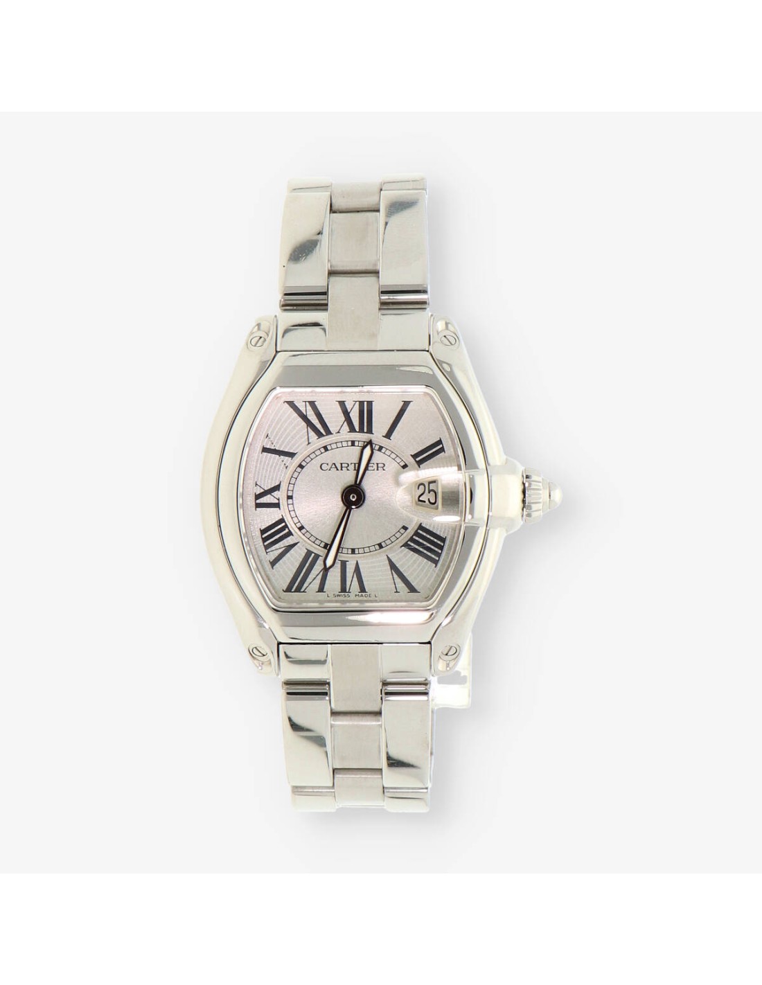Magnifico reloj Cartier Roadster de segunda mano en perfecto estado de marcha y conservación ref: 2675. movimiento automático. Caja en acero de 31 x 37 mm. Resistencia al agua de 10 atmosferas con bisel en acero, cristal zafiro y fondo plata con números romanos. Correa en acero con cierre desplegable en acero.