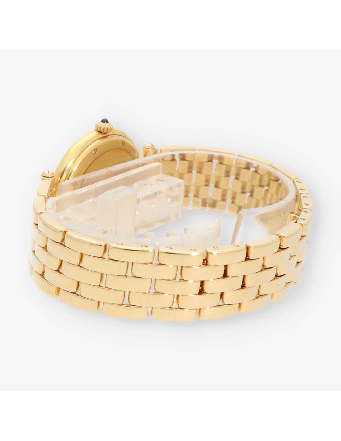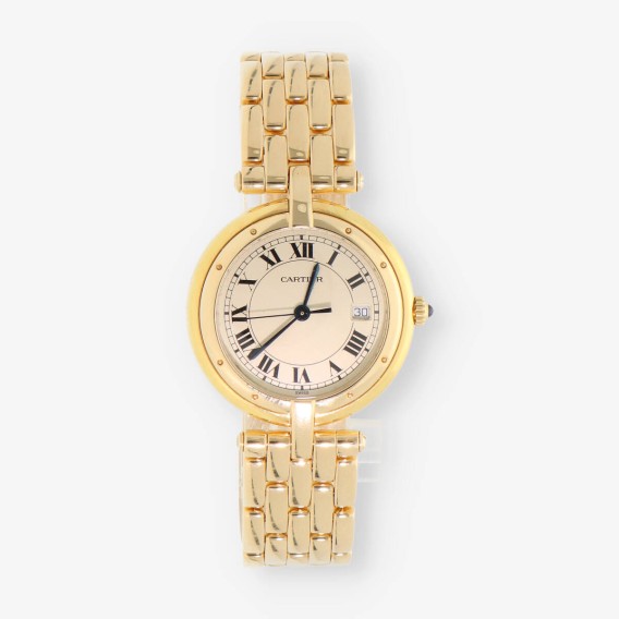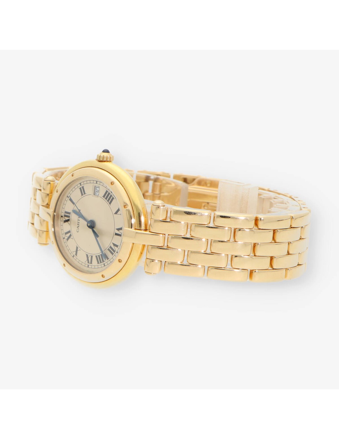 Magnifico reloj Cartier de segunda mano en perfecto estado de marcha y conservación. Con movimiento de cuarzo. Caja de 33mm. en oro amarillo de primera ley, bisel en oro, cristal zafiro, fondo blanco y números romanos. Correa en oro y cierre de broche plegable en oro. Un reloj idóneo para cualquier amante de la firma.