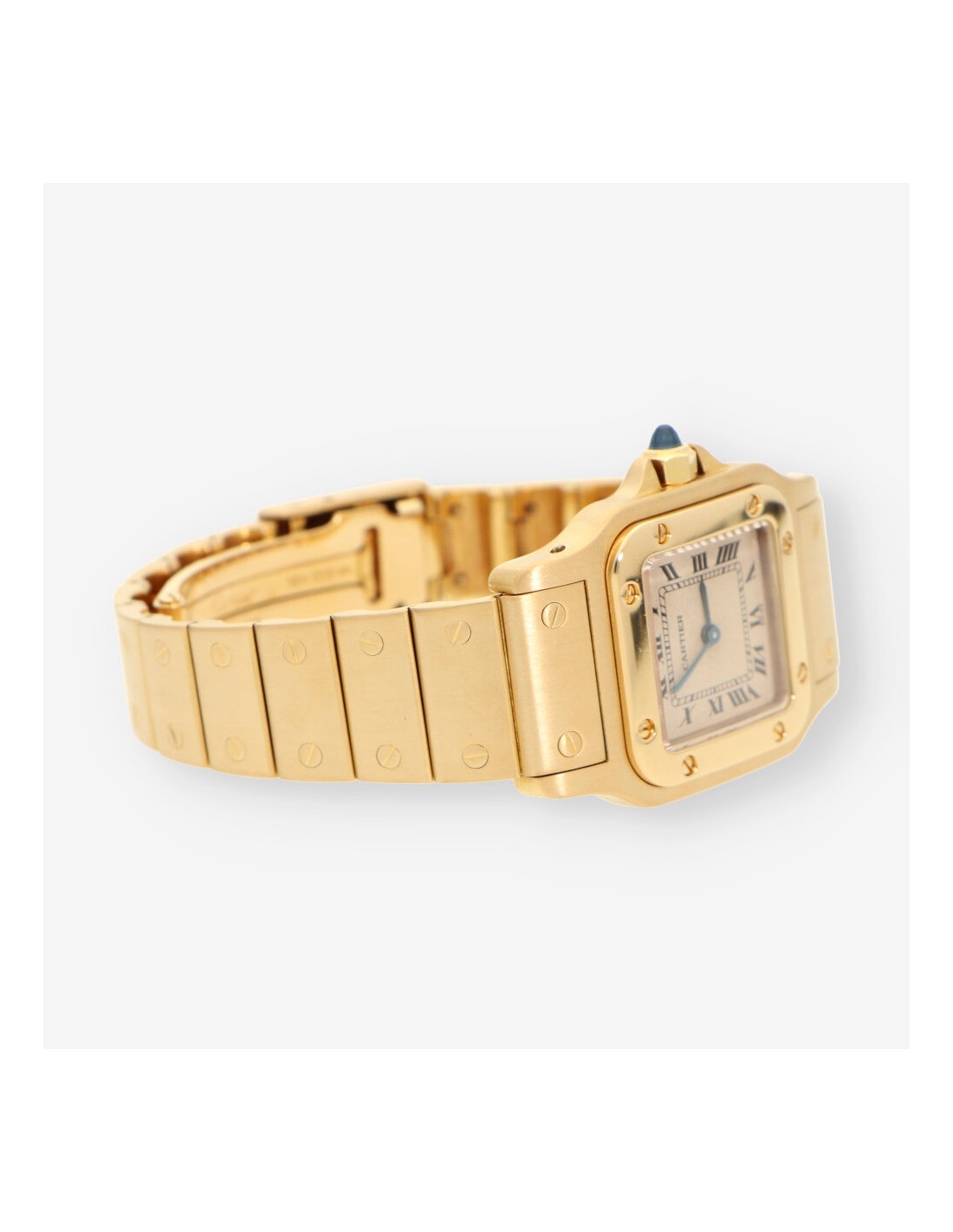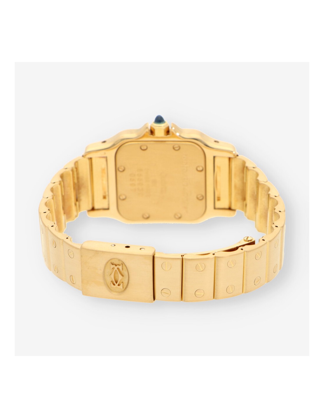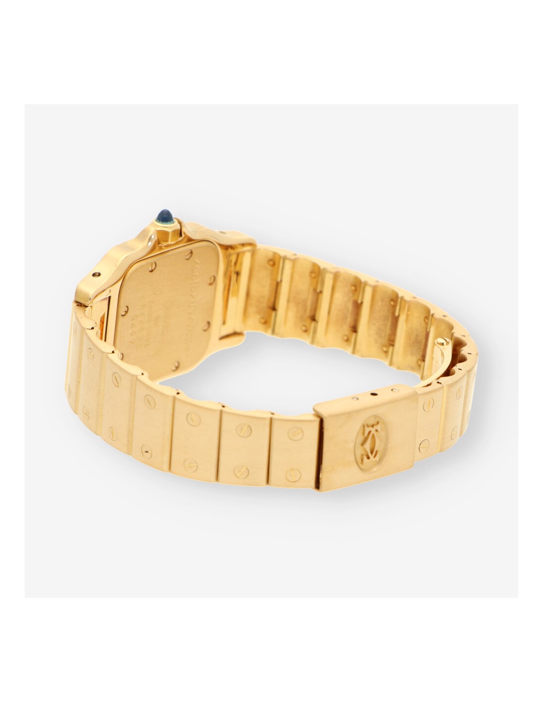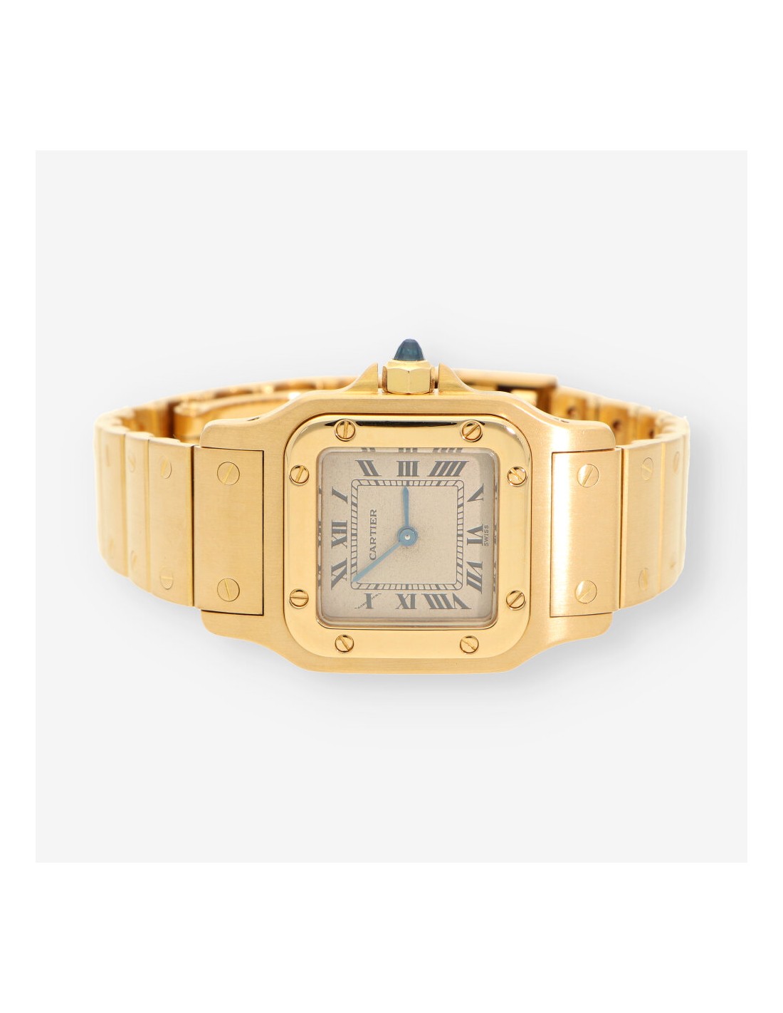 Magnifico reloj Cartier Santos de segunda mano en perfecto estado de marcha y conservación. Con movimiento de cuarzo. Caja de 26mm x 36mm en oro. Cristal zafiro, fondo blanco y números romanos. Correa y cierre en oro. Un reloj idóneo para los amantes de la firma, perfecto para cualquier ocasión.