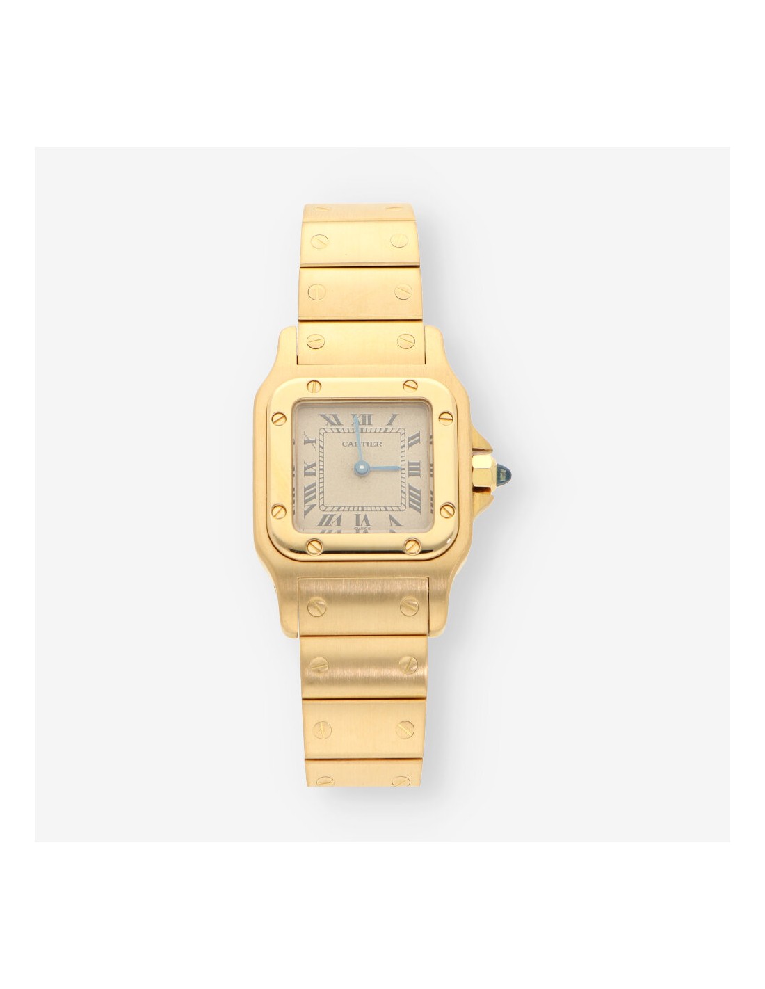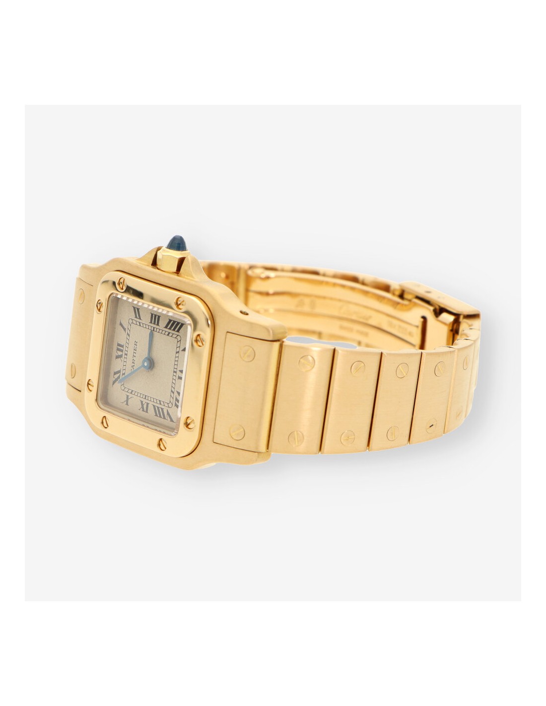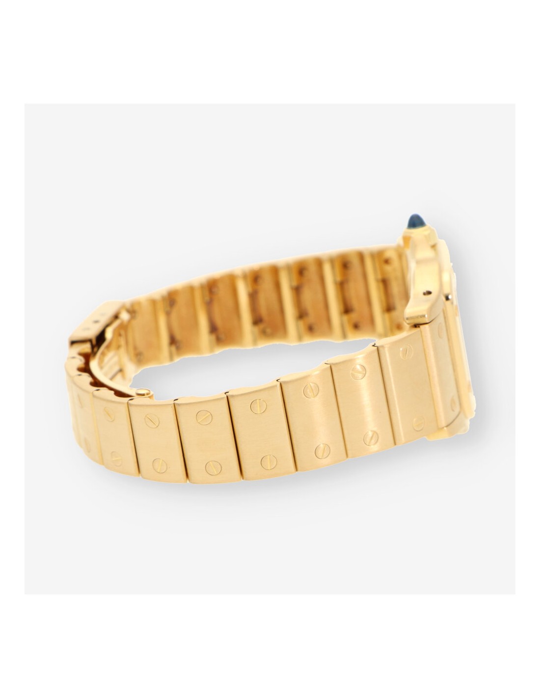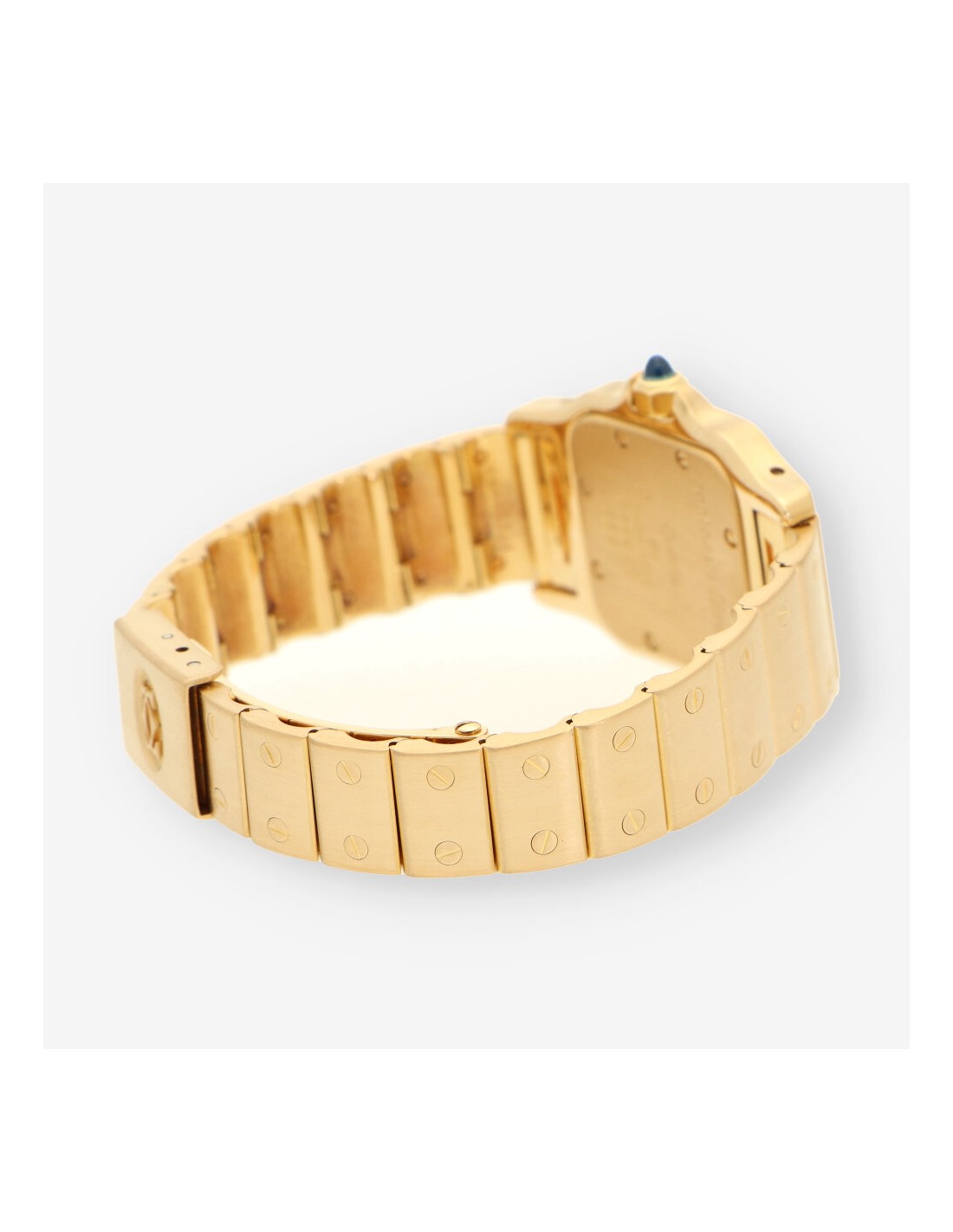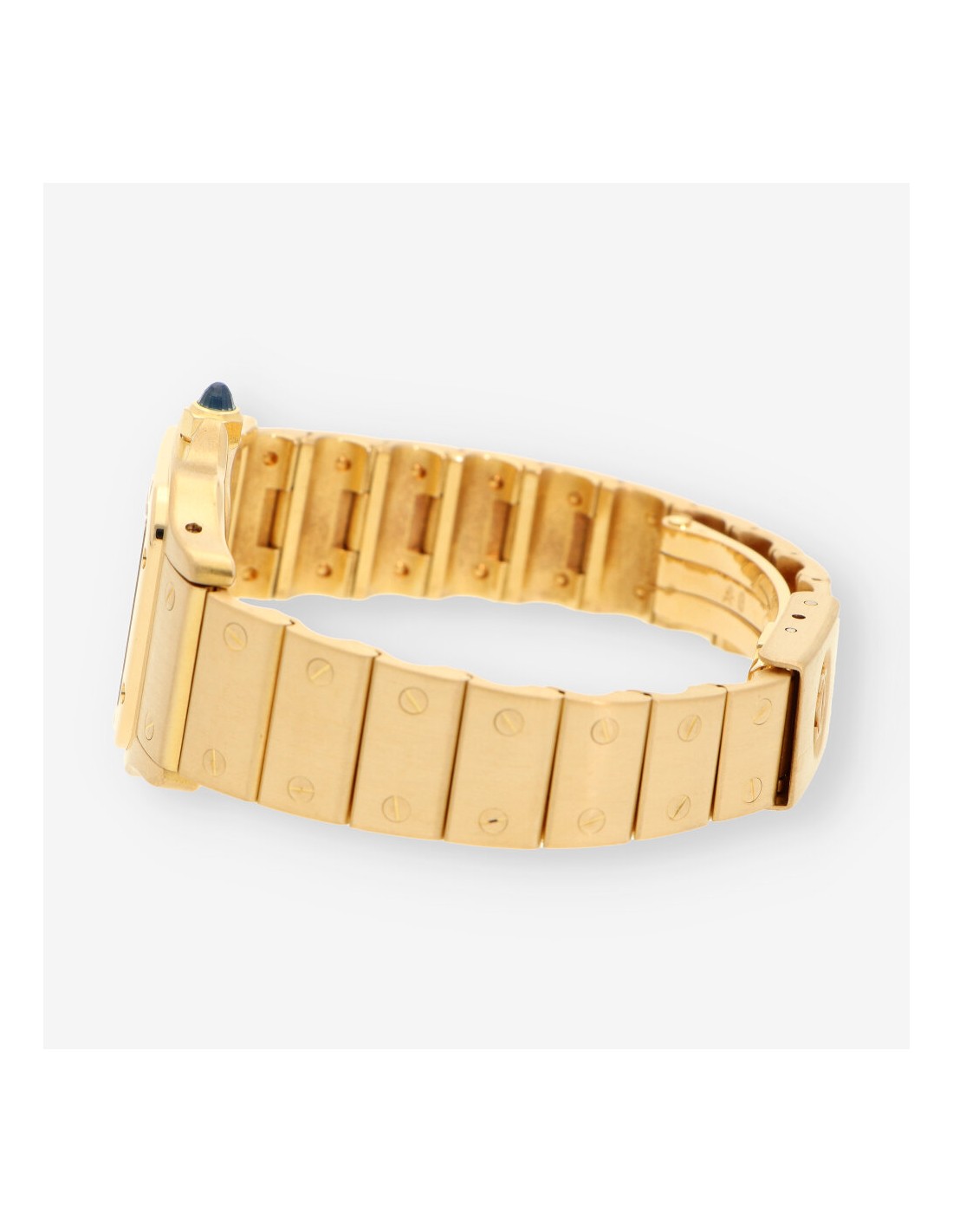 Magnifico reloj Cartier Santos de segunda mano en perfecto estado de marcha y conservación. Con movimiento de cuarzo. Caja de 26mm x 36mm en oro. Cristal zafiro, fondo blanco y números romanos. Correa y cierre en oro. Un reloj idóneo para los amantes de la firma, perfecto para cualquier ocasión.