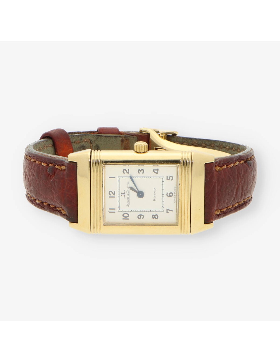 Magnifico reloj Jaeguer Le Cultre de segunda mano en perfecto estado de marcha y conservación. Con movimiento de cuarzo y caja en oro de primera ley con cristal zafiro y fondo blanco. Correa de piel marron y cierre en de hebilla en oro amarillo.