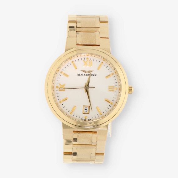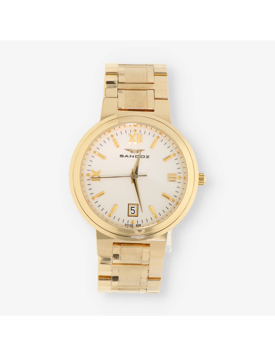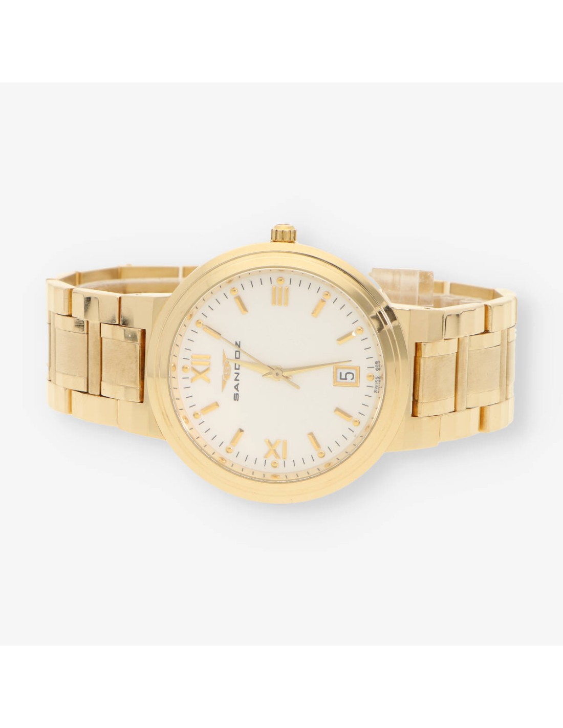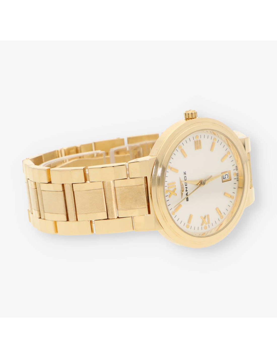 Magnífico reloj Sandoz Quartz de segunda mano en oro amarillo de primera ley. Caja de 36mm en oro de primera ley. Fondo blanco sin números, agujas doradas. Mecanismo de Quartz. Correa y cierre de broche plegable en oro.