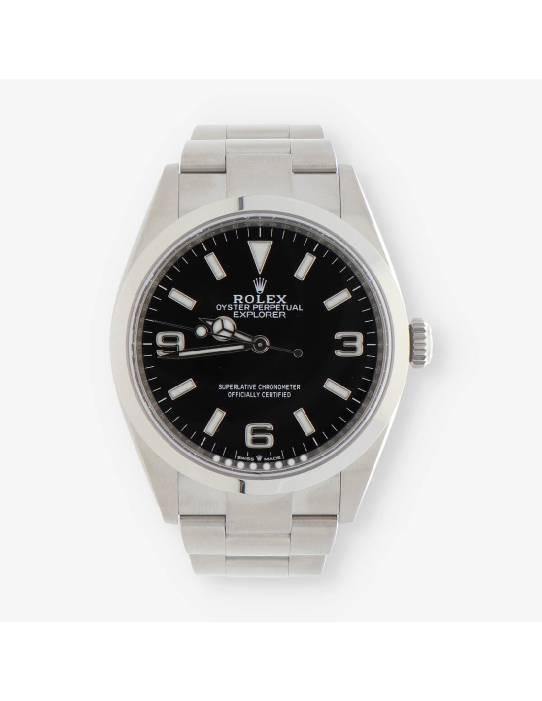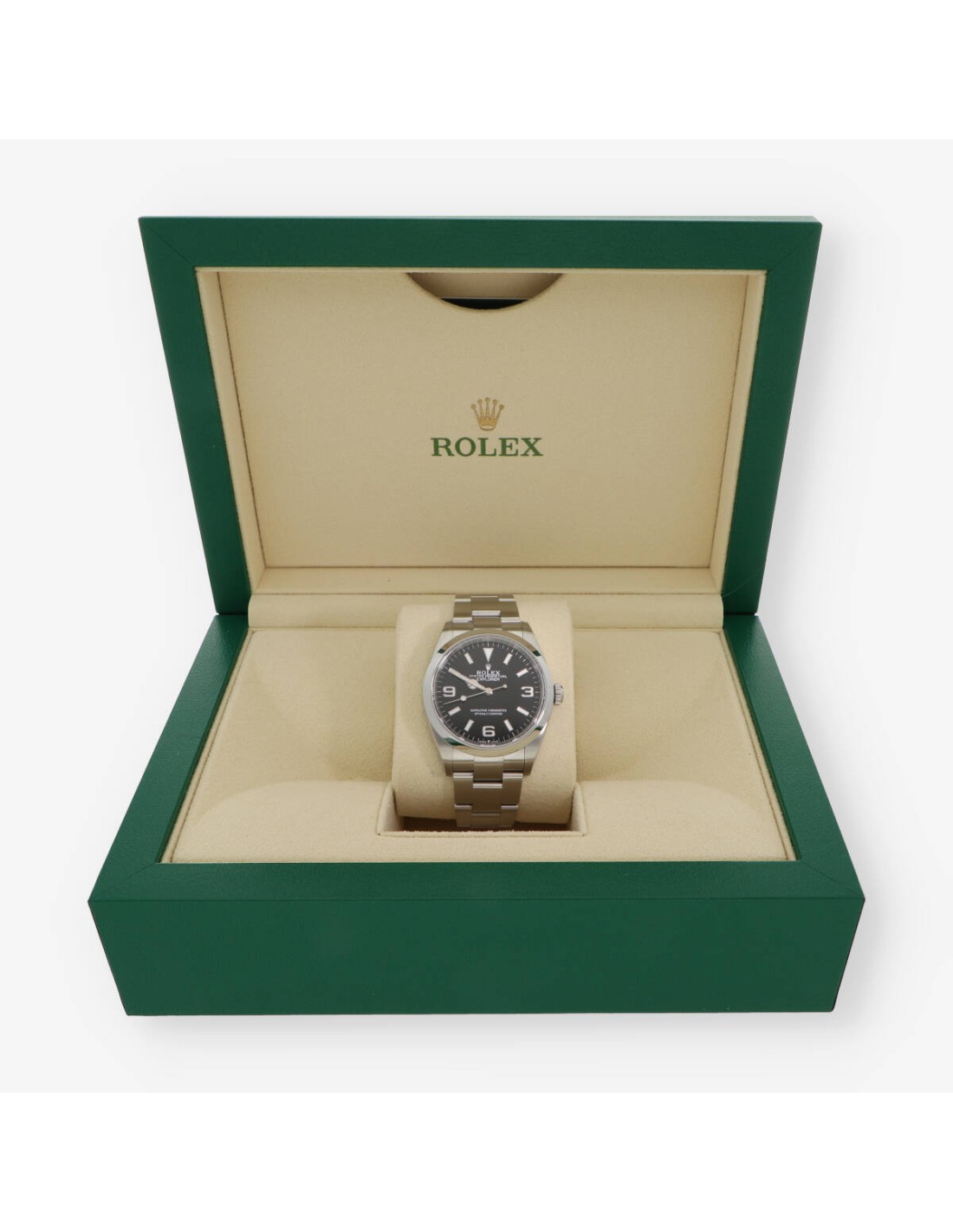 Magnifico Rolex explorer nuevo a estrenar del año 2022 con caja y documentos. Ref: 124270, cuerda automática del calibre 3230 con una reserva de marcha de 70h y 31 joyas en su interior. Caja en acero 36mm resistencia al agua 10ATM, cristal zafiro, esfera en negro sin números excepto las 3, 6 y 9. Correa en acero y cierre de broche plegable en acero.