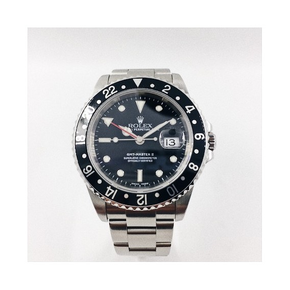 Rolex GMT-Master II de segunda mano en acero, ref. 16710 del año 2008. Caja de acero con fondo roscado, corona atornillada, bisel giratorio color negro con escala 24 horas, cristal zafiro con lupa para la fecha. Esfera color negro con agujas e índices luminiscentes, fecha a las 3. Mecanismo automático. Pulsera Oyster en acero con cierre desplegable. Diámetro: 39 mm. Longitud: 17 cm. En perfecto estado de marcha y conservación.