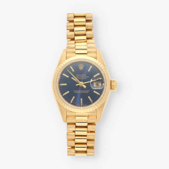 Magnifico rolex Lady Datejust de segunda mano en perfecto estado de marcha y conservación con referencia: 69178 . Cuerda automática con una reserva de marchas de 42 horas. Caja de 26mm en oro Cristal zafiro fondo azul sin cifras y resistencia al agua de 10 atmósferas. Correa en oro con cierre de broche plegable en oro. Año 1987.