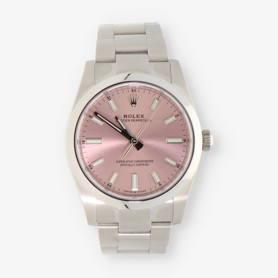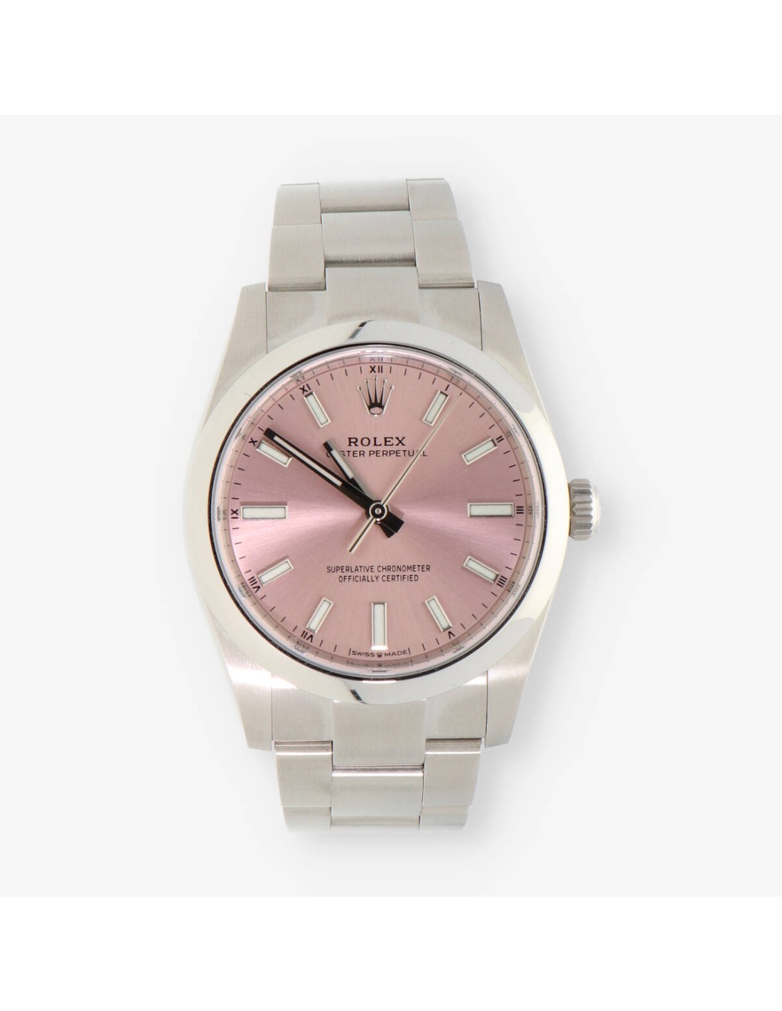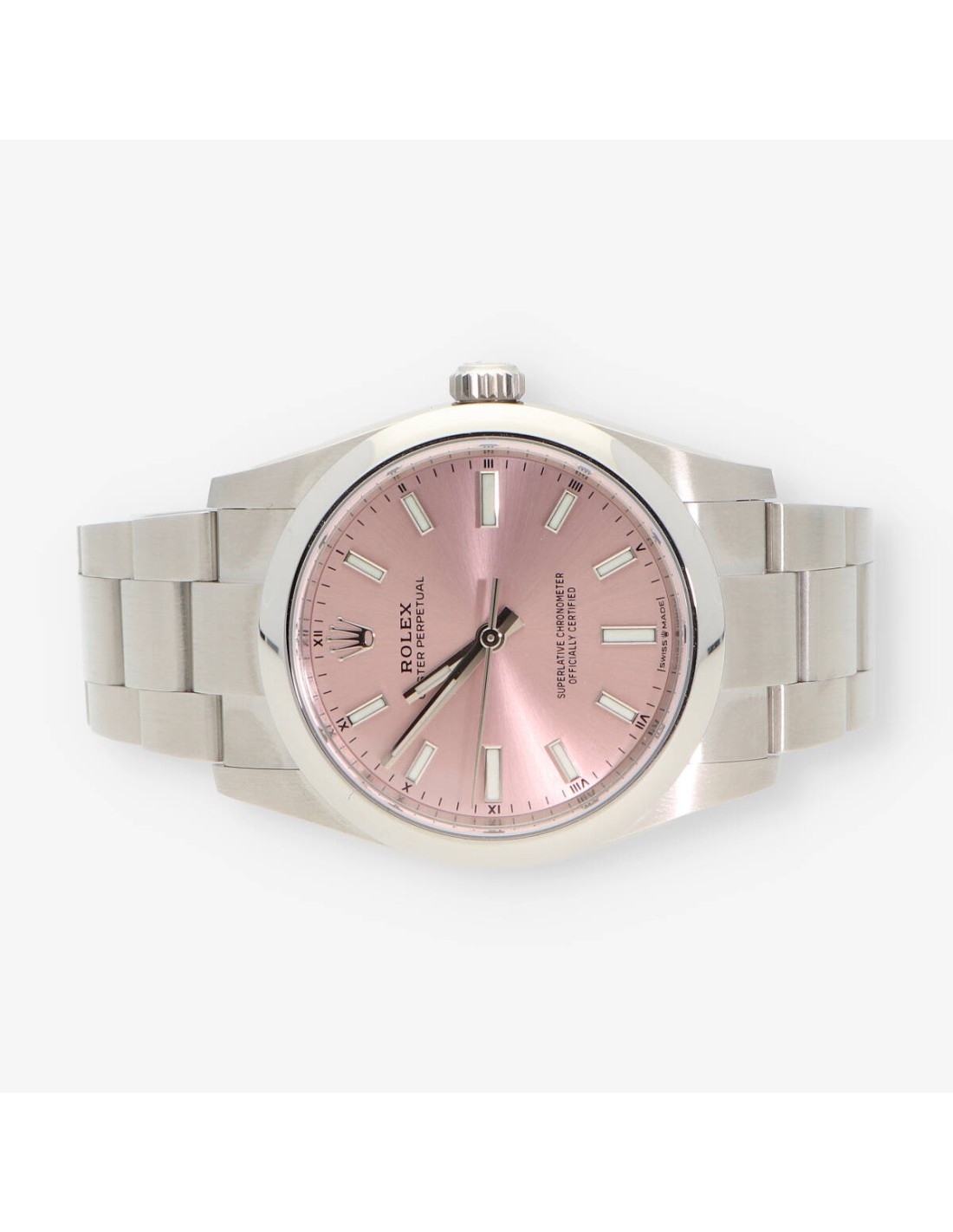 Magnifico Rolex Oyster Perpetual nuevo a estrenar. Ref: 124200, cuerda automática del calibre 2232 con una reserva de marcha de 55h y 31 joyas en su interior. Caja en acero 34mm resistencia al agua 10ATM, cristal zafiro, esfera en rosa sin números. Correa en acero y cierre de broche plegable en acero. Año 2022.