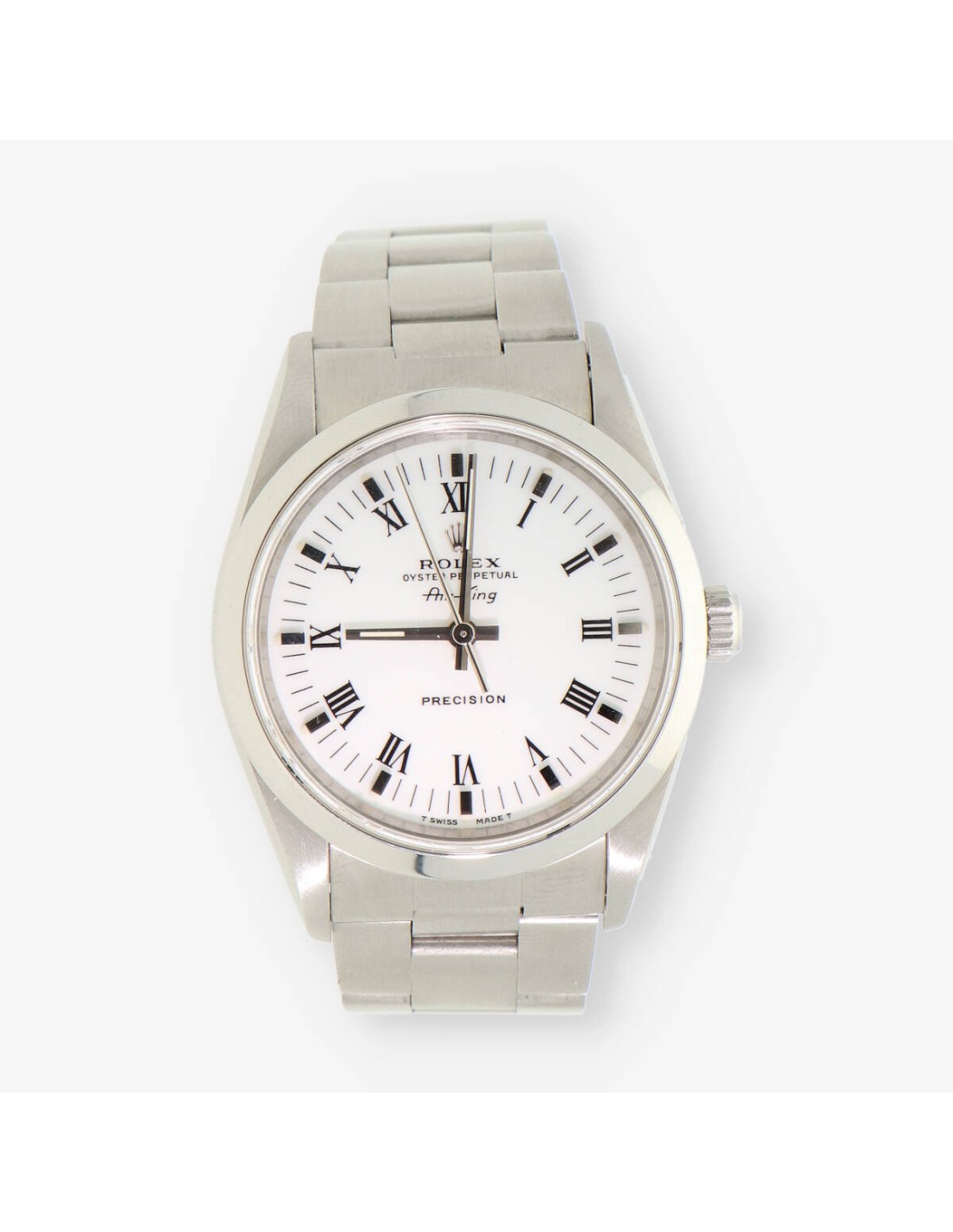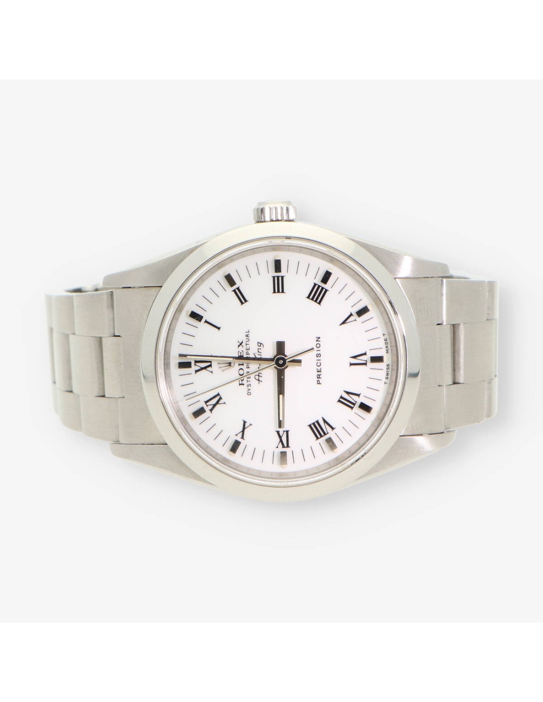 Magnifico Rolex Perpetual de segunda mano en perfecto estado de marcha y conservación. Ref: 14000 con cuerda automática con una reserva de marchas de 42 horas. Caja de 34mm en acero, cristal zafiro, fondo blanco con números romanos. Correa y cierre en acero. Año aproximado 1996.