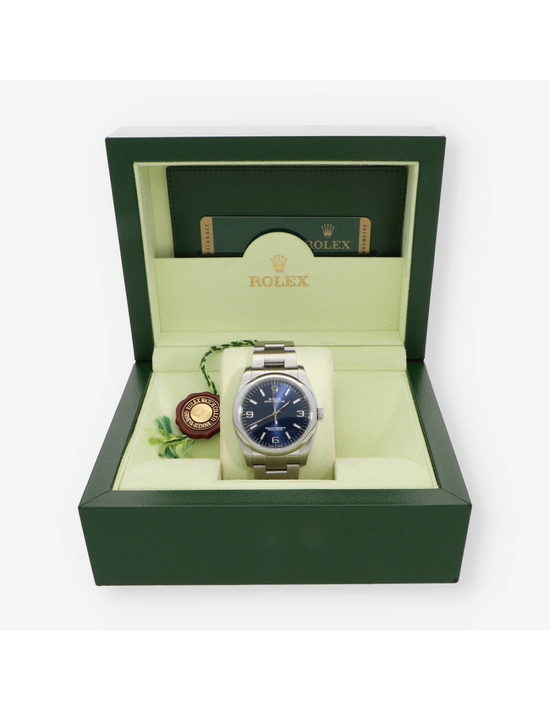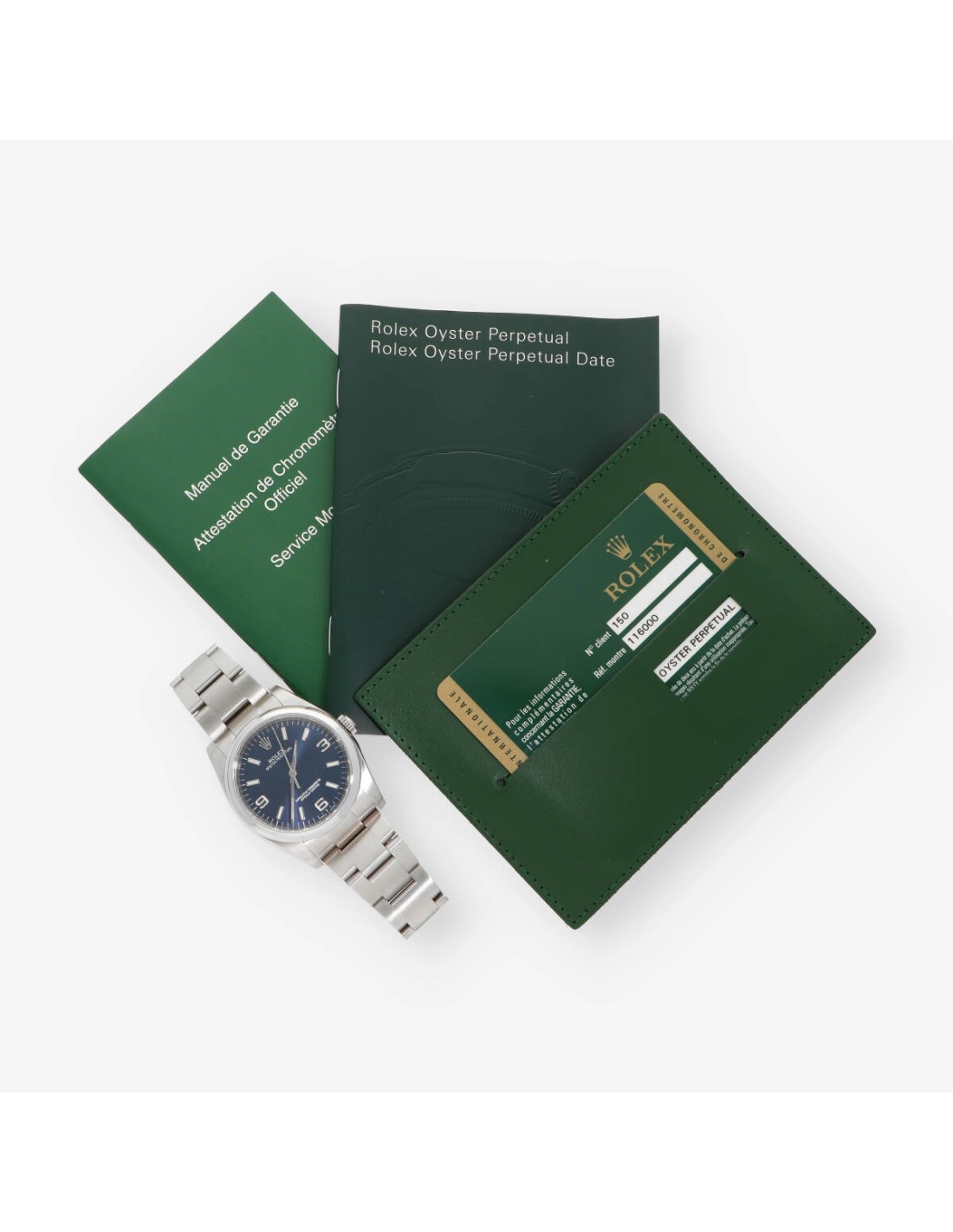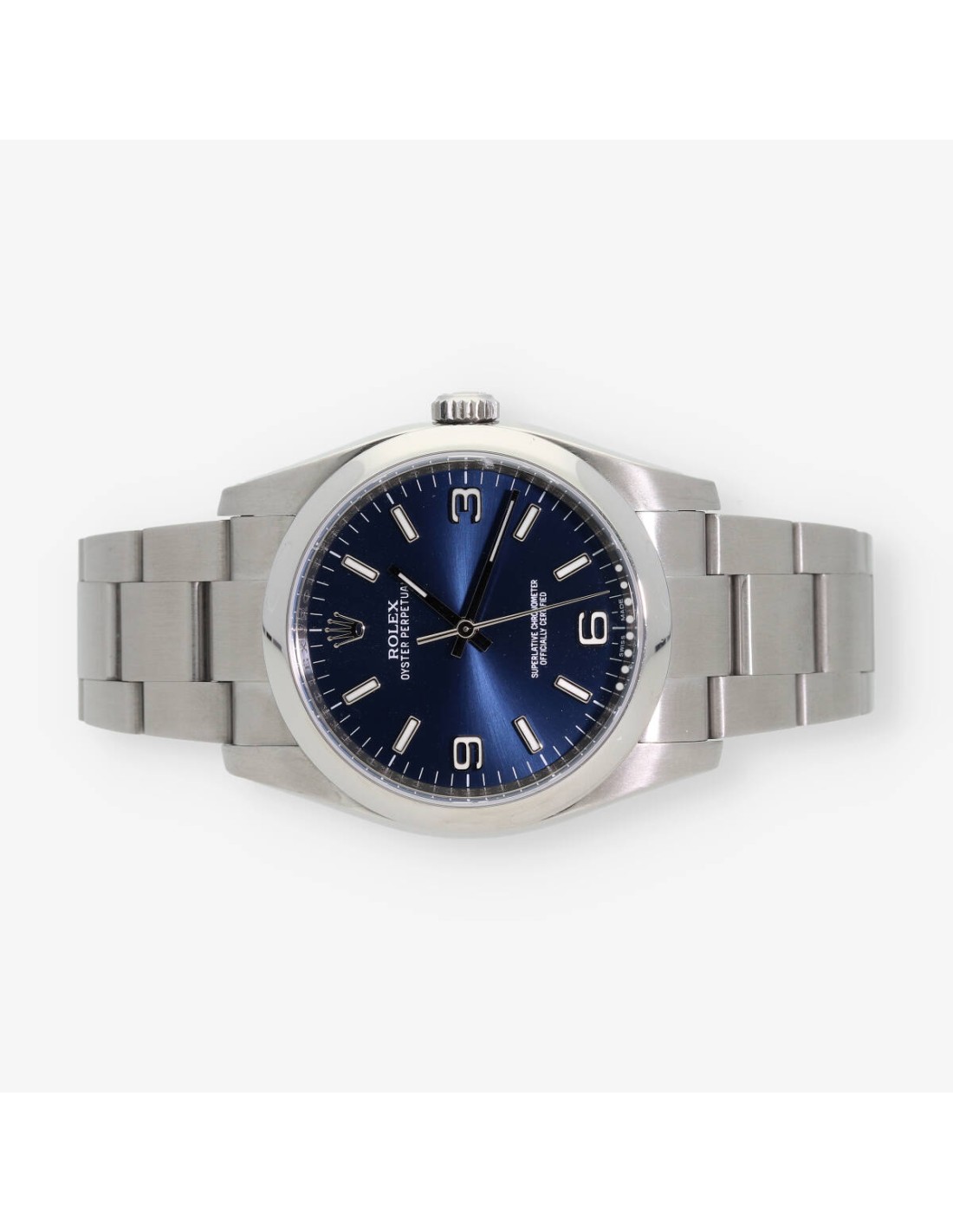 Magnifico Rolex Oyster Perpetual de segunda mano en perfecto estado. Ref: 116000, cuerda automática del calibre 3130 con una reserva de marcha de 48h y 31 joyas en su interior. Caja en acero 36mm resistencia al agua 10ATM, cristal zafiro, esfera en azul sin números. Correa en acero y cierre de broche plegable en acero. Año 2013.