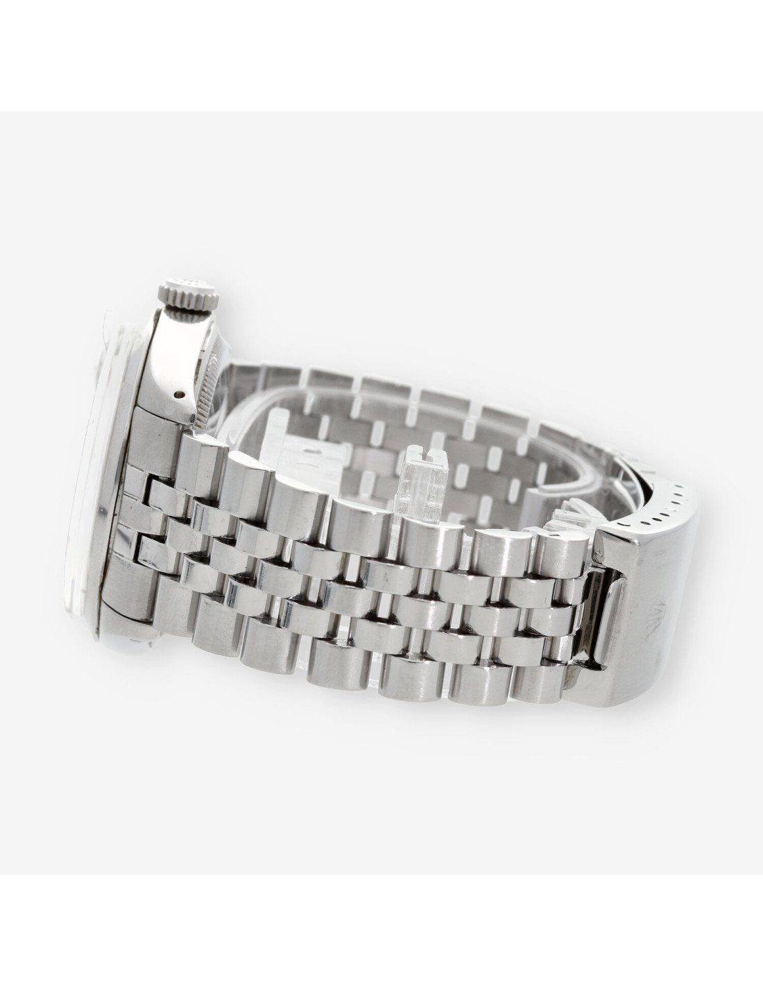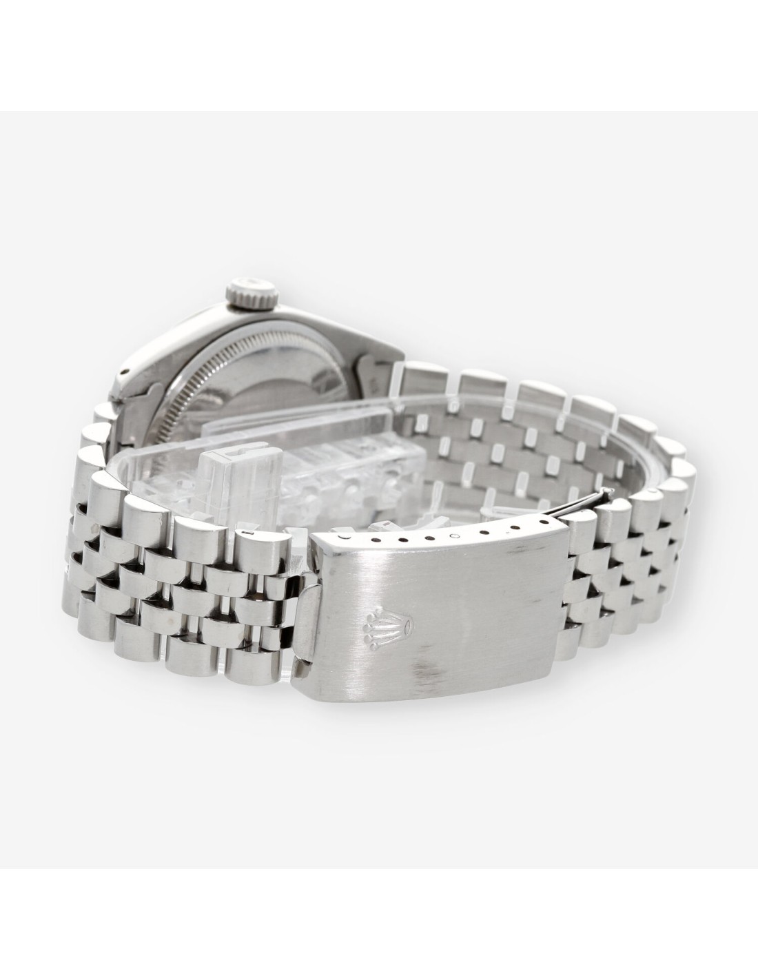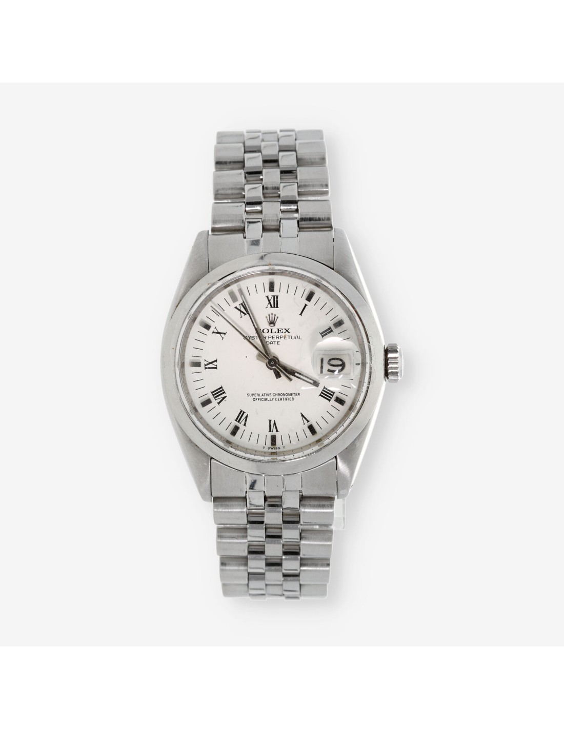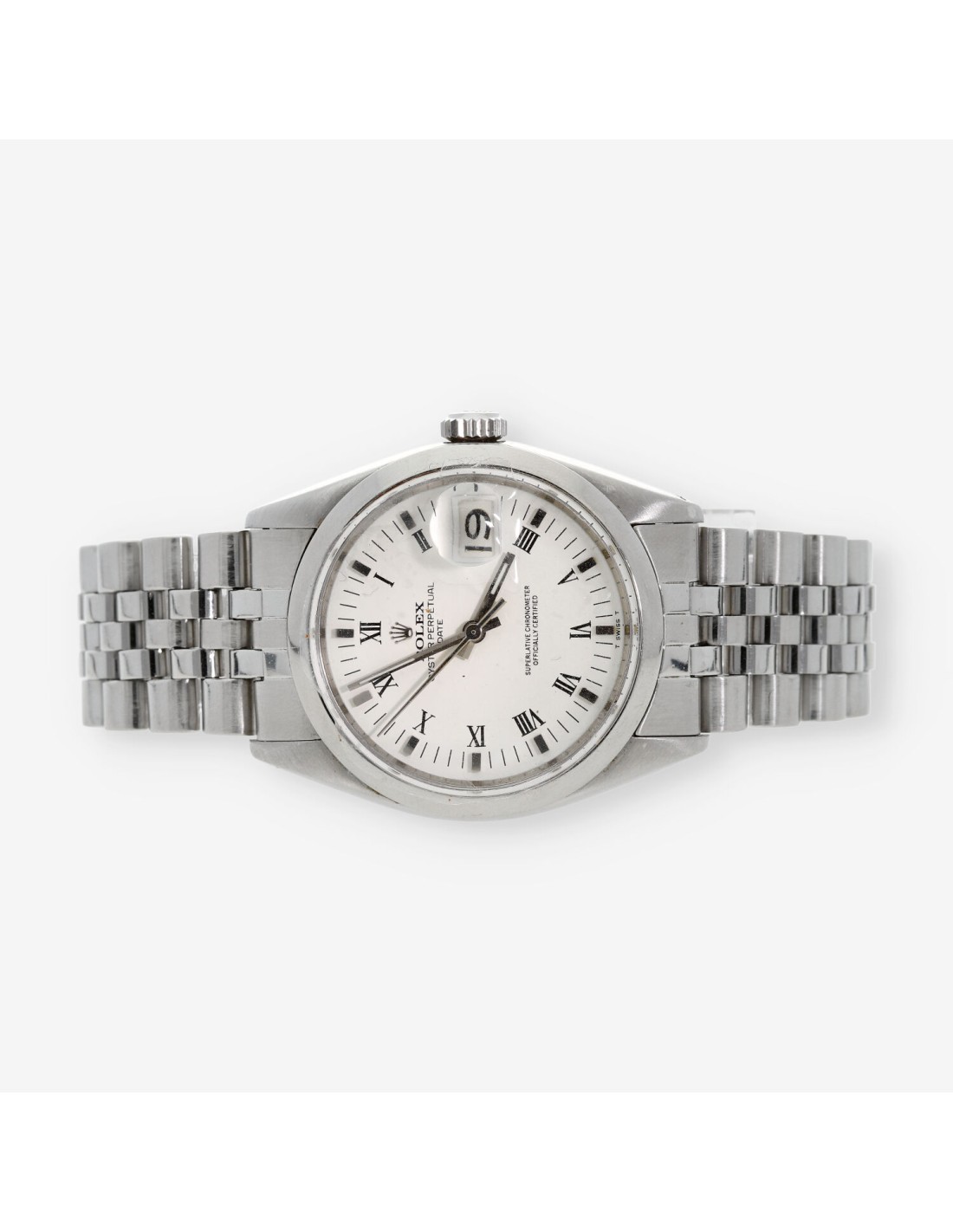 Magnifico Rolex Oyster Perpetual Date de segunda mano en perfecto estado de marcha y conservacion. Ref: 1500, movimiento automático. Caja en acero 34mm, cristal zafiro, esfera blanca con números romanos. Correa en acero y cierre de broche plegable en acero. Año 1960 (aprox).