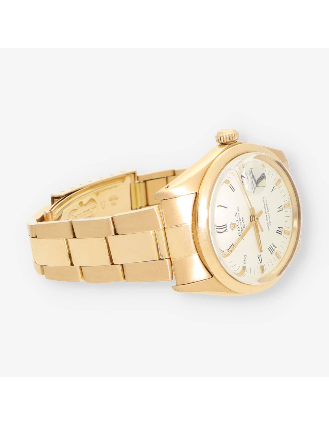 Magnifico Rolex Oyster Perpetual Date de segunda mano en perfecto estado de marcha y conservacion. Ref: 1500, movimiento automático del calibre 1570. Caja en oro 34mm, cristal plexiglas, esfera blanca con números romanos. Correa y cierre de broche plegable en oro. Año 1972 (aprox).