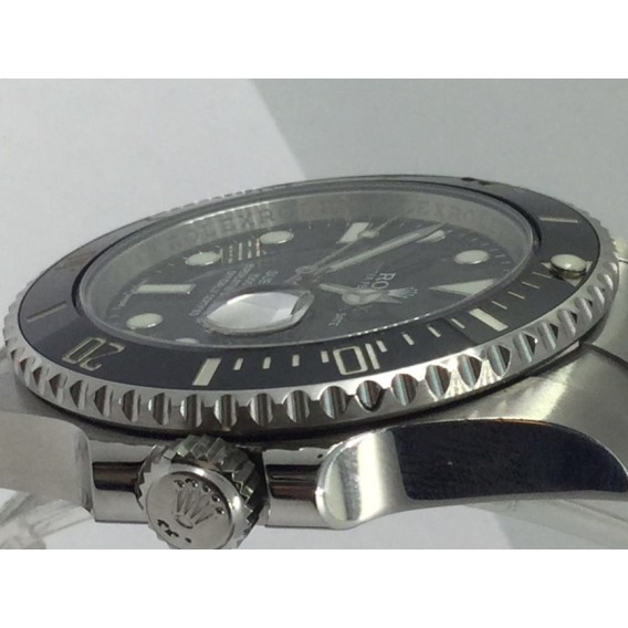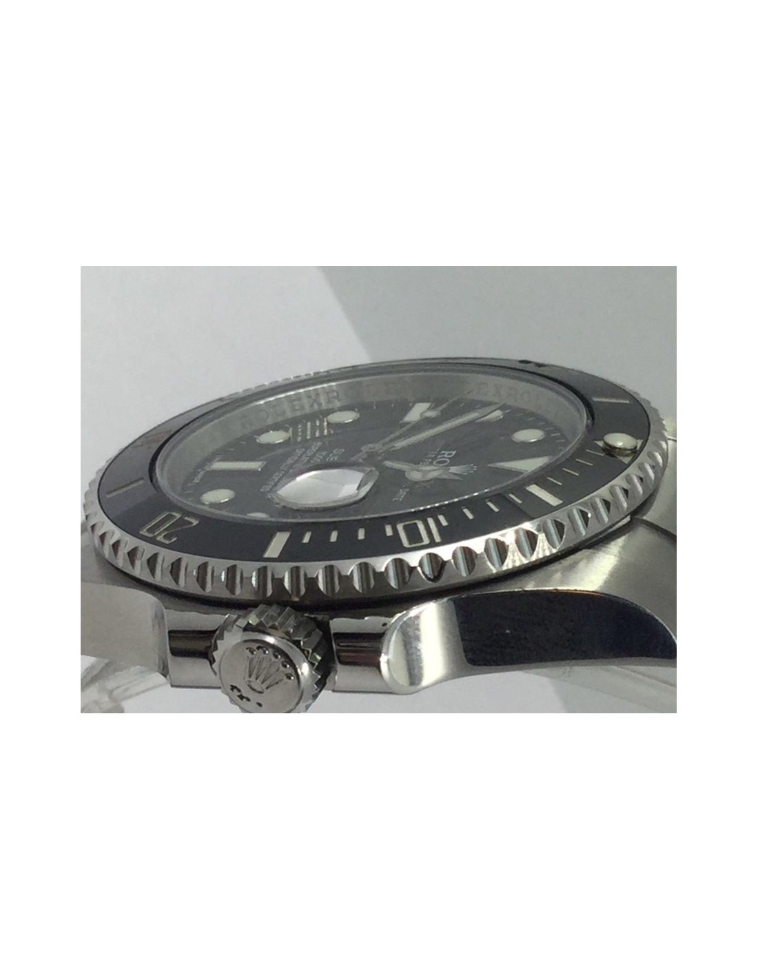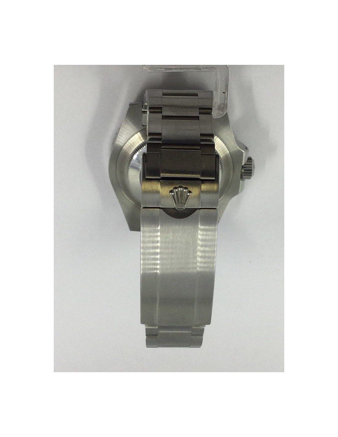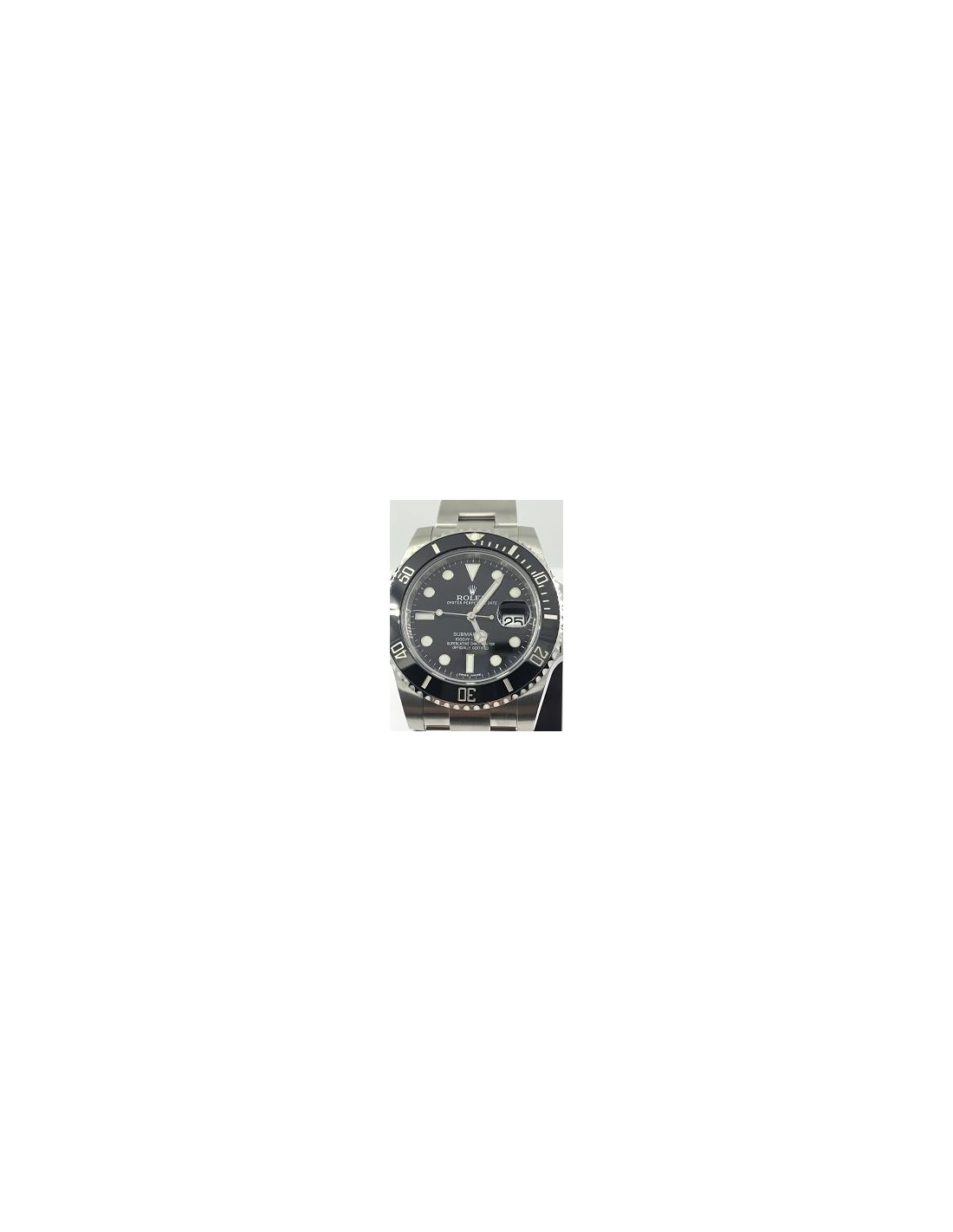 Rolex Oyster Perpetual Submariner de segunda mano. Fondo roscado, corona roscada, cristal zafiro, bisel cerámico giratorio unidireccional. Esfera color negro con índices y agujas luminiscentes, fecha a las 3. Mecanismo automático. Diámetro: 40 mm. Pulsera Oyster de acero con cierre desplegable regulable. Longitud: 18,5 cm. En perfecto estado.