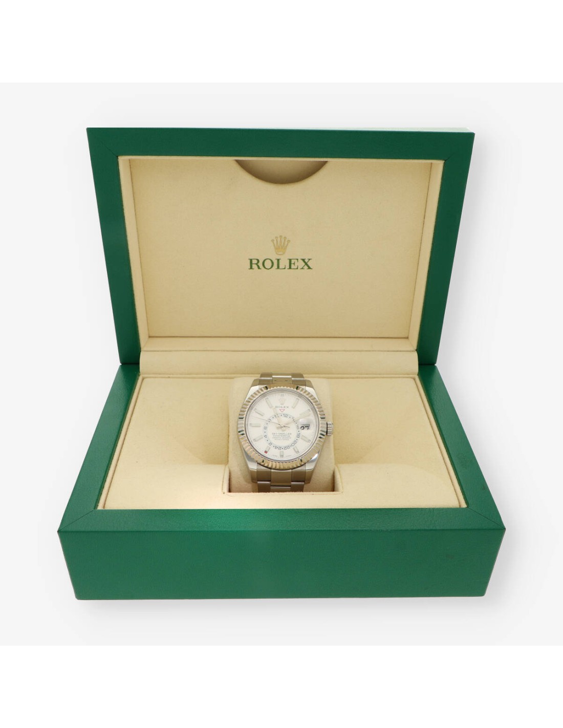 Magnífico Rolex Sky-Dweller de segunda mano en perfecto estado de marcha y conservación. Ref: 326934 del año 2018, con cuerda automática. Caja de 42mm en acero con cristal zafiro, fondo blanco sin cifras, con una reserva de marcha de 72 horas y resistencia al agua de 10 atmósferas. Correa y cierre en acero.