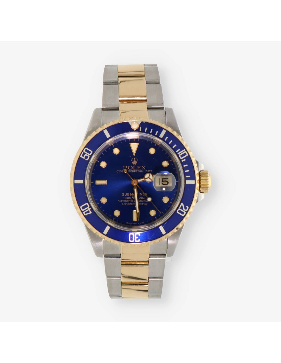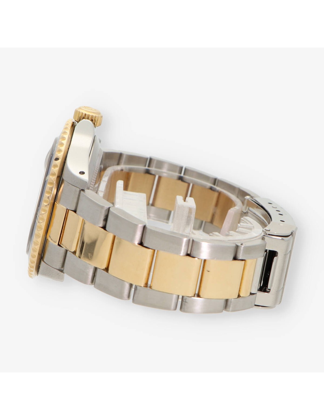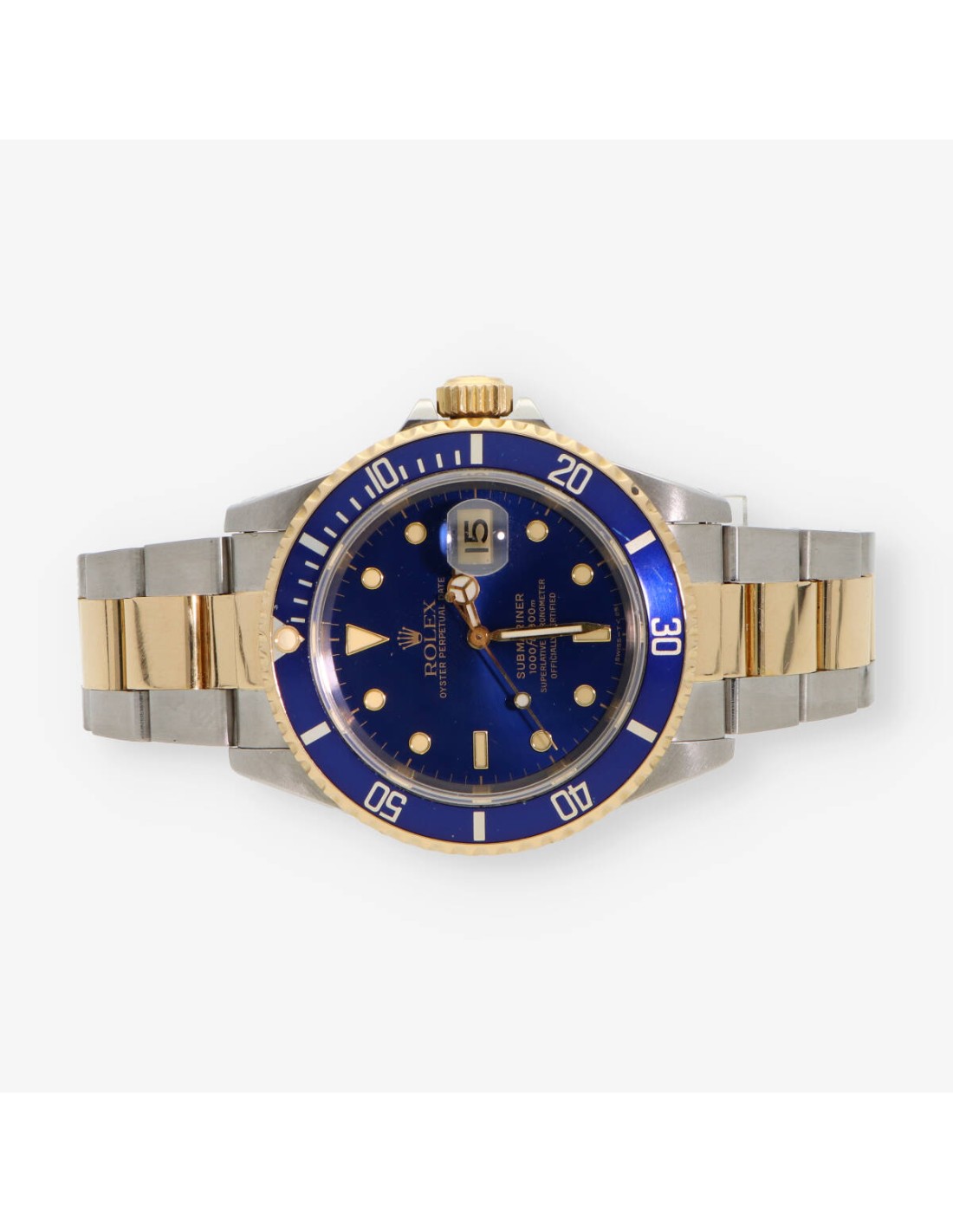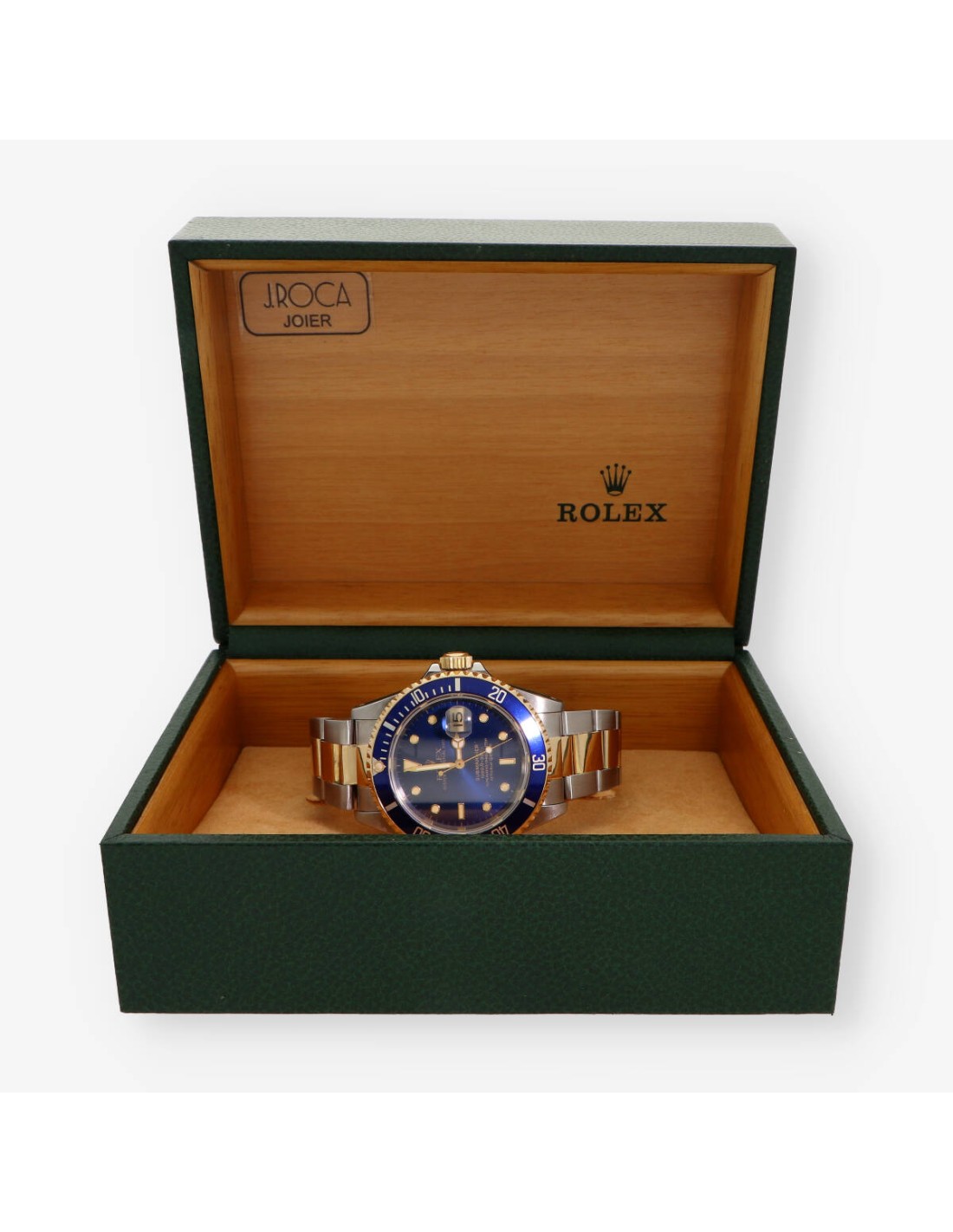 Magnífico rolex Submariner mixto de segunda mano en perfecto estado de marcha y conservación. Ref: 16613 de año 1984, con cuerda automática del calibre 3135. Caja de 40mm en acero y oro con cristal zafiro, fondo azul sin cifras, bisel oro amarillo, con una reserva de marcha de 48 horas y resistencia al agua de 30 atmósferas. Correa y cierre en acero y oro.
