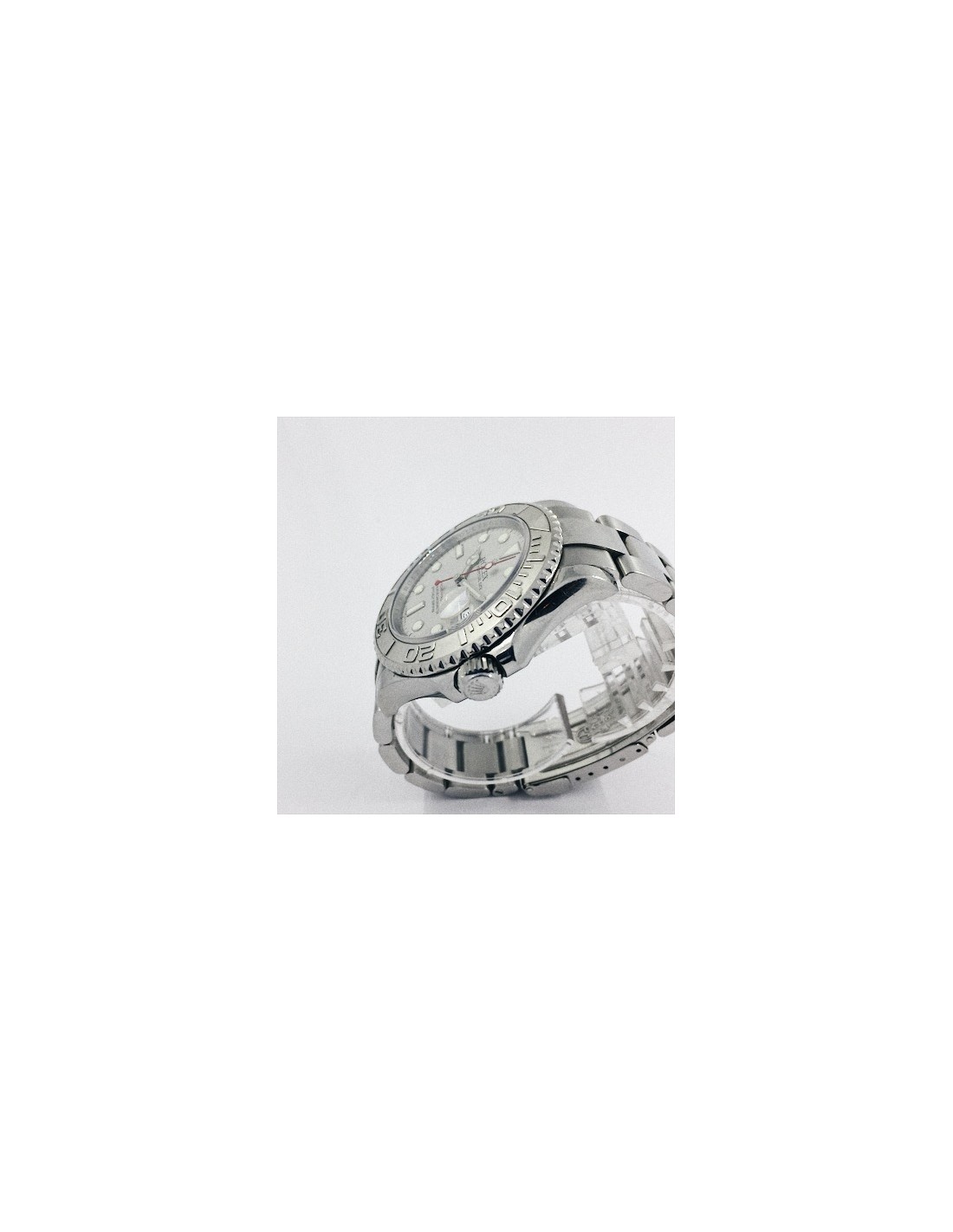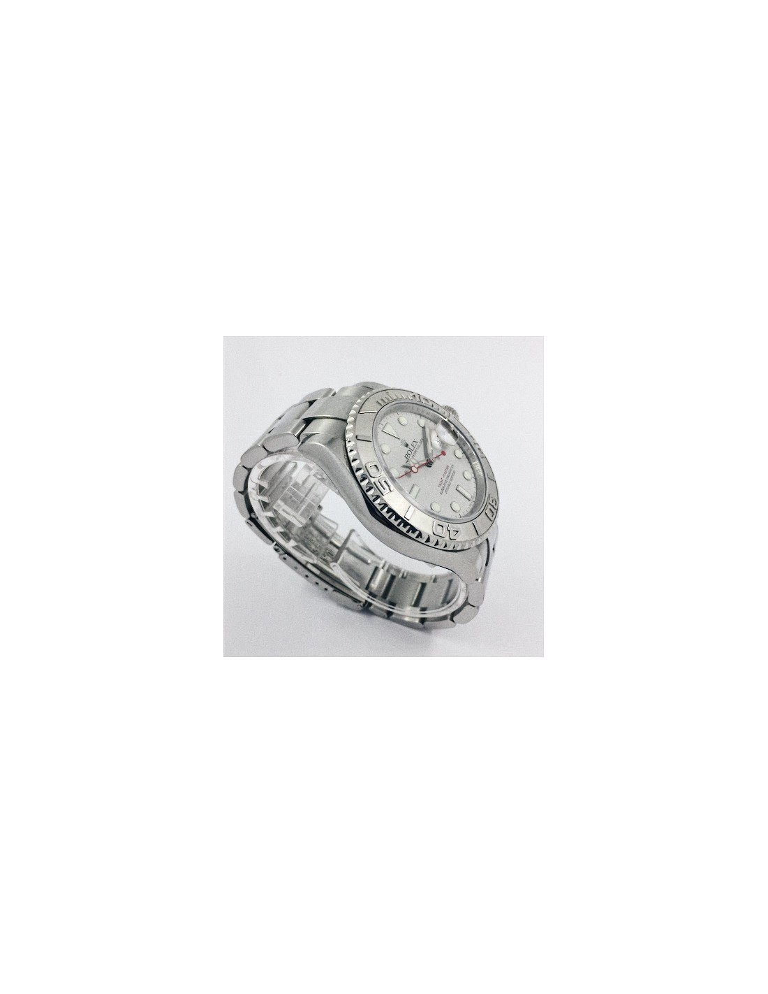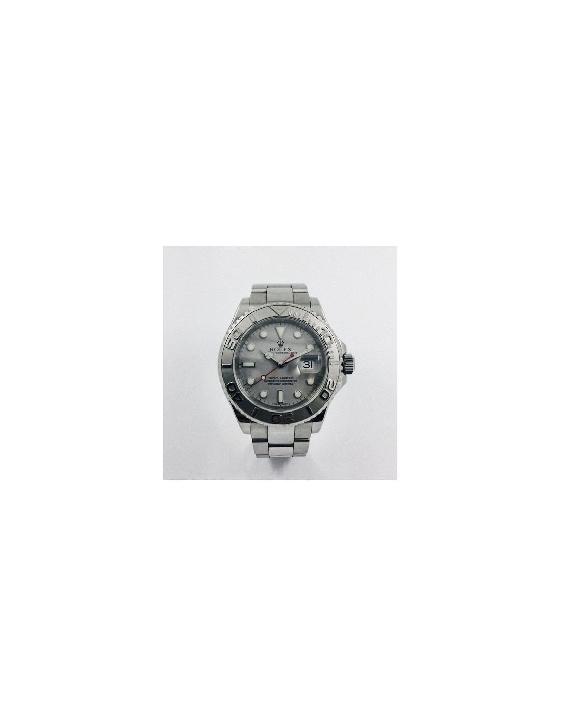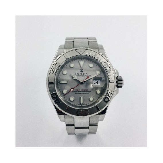Rolex Yacht-Master de segunda mano en acero. Caja de acero con fondo roscado, corona atornillada, bisel giratorio en platino, cristal zafiro. Esfera gris con índices y agujas luminiscentes, segundero color rojo, fecha a las 3. Diámetro: 40 mm. Pulsera Oyster de acero con cierre desplegable. Longitud: 16,5 cm.