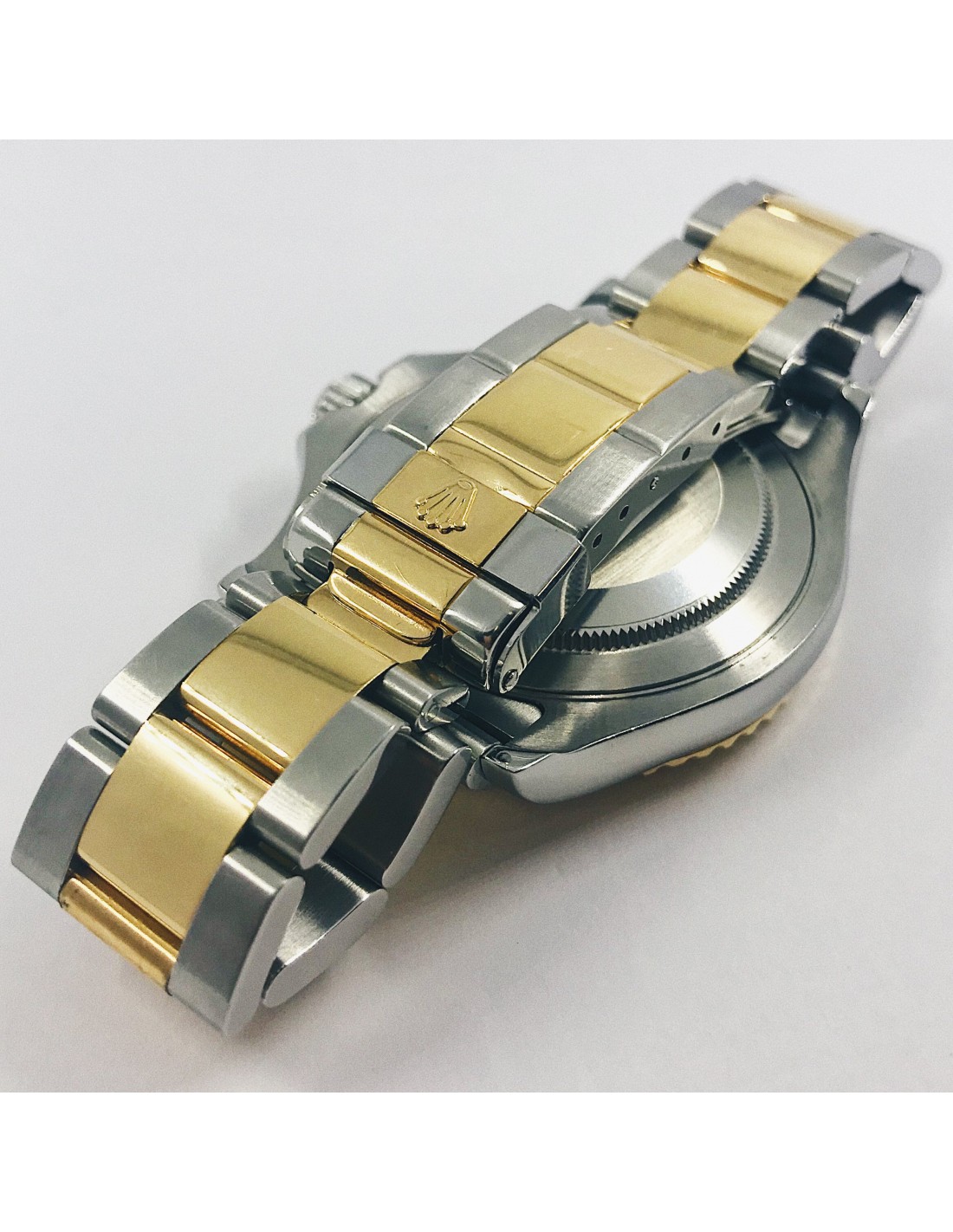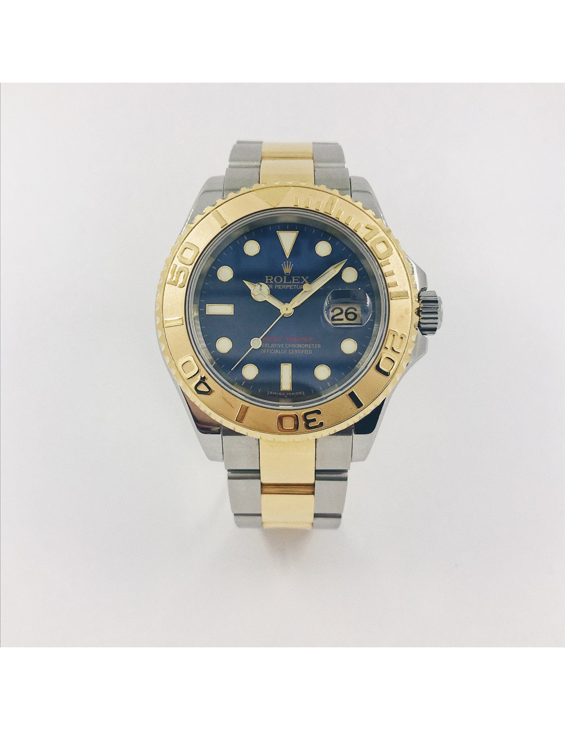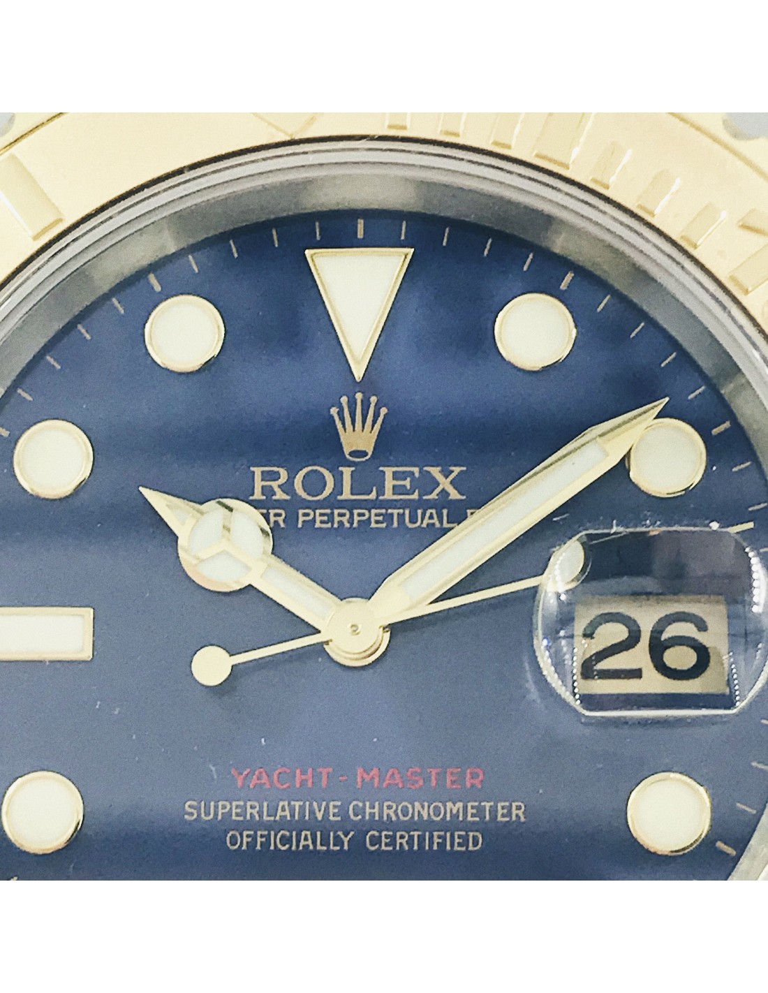 Rolex Yacht-Master 40 de segunda mano en perfectas condiciones y estado de marcha. Corona atornillada con caja en acero y oro y cuerda automática, diámetro de 40mm y 31 joyas en su interior. Bisel en oro amarillo con cristal de zafiro y esfera azul sin números. Correa en acero y oro con cierre en broche plegeuable en acero y oro también. Con caja y documentos originales.