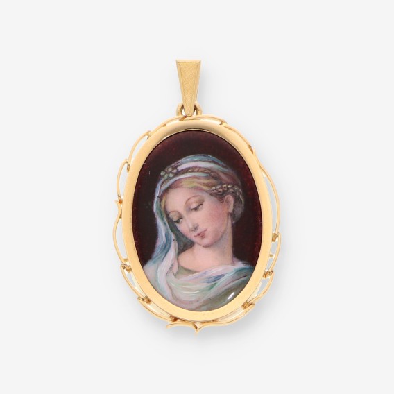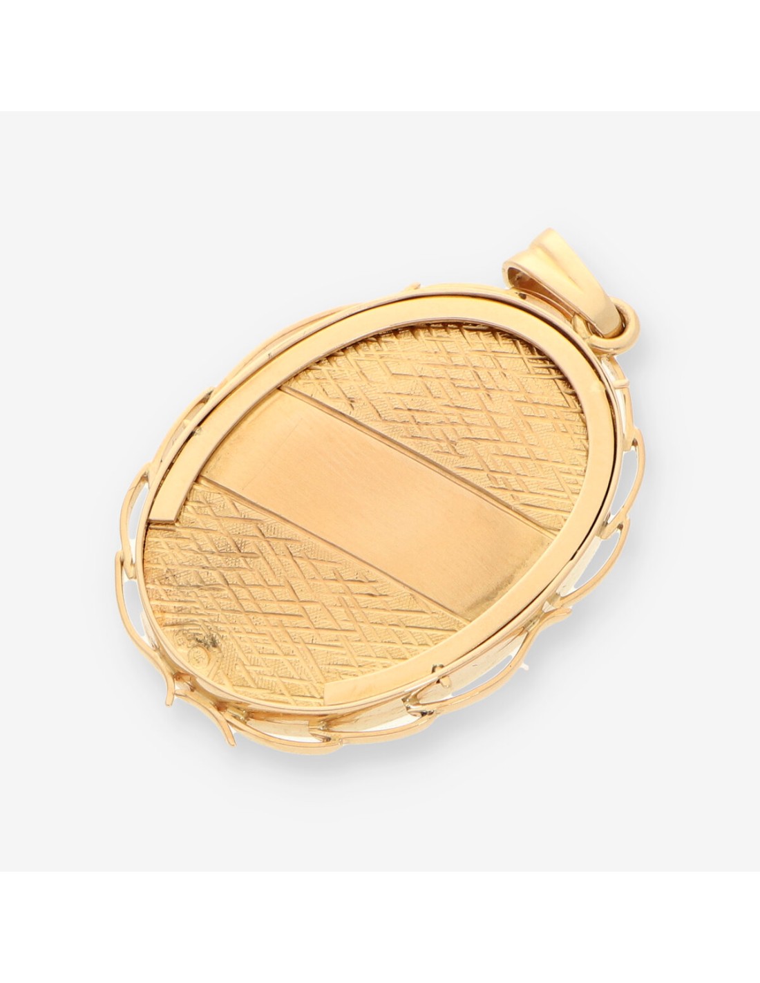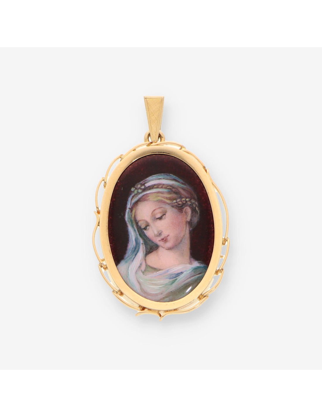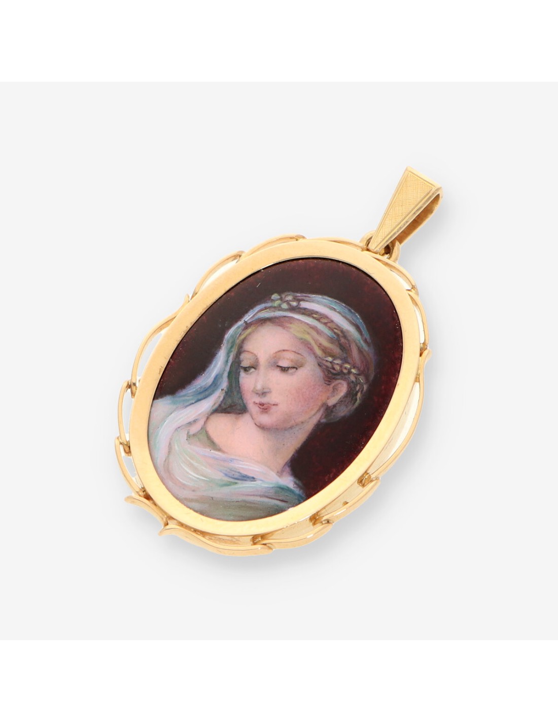 Descubre la elegancia atemporal con este exclusivo colgante de oro de primera ley, una pieza de joyería de segunda mano que irradia historia y sofisticación. El colgante presenta un hermoso retrato esmaltado a mano, que captura la esencia de la belleza clásica. El marco de oro cuidadosamente diseñado realza la obra de arte, ofreciendo un toque de lujo y distinción. Alto: 4.3cm. Ancho: 2.6cm. Peso: 10.5gr.