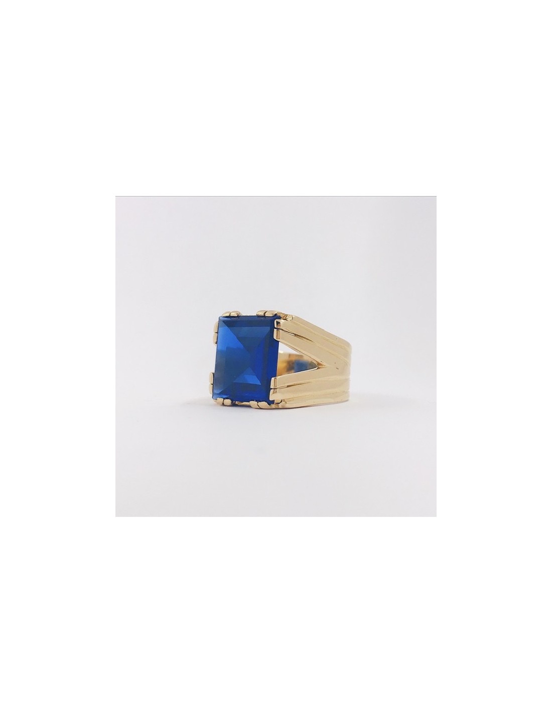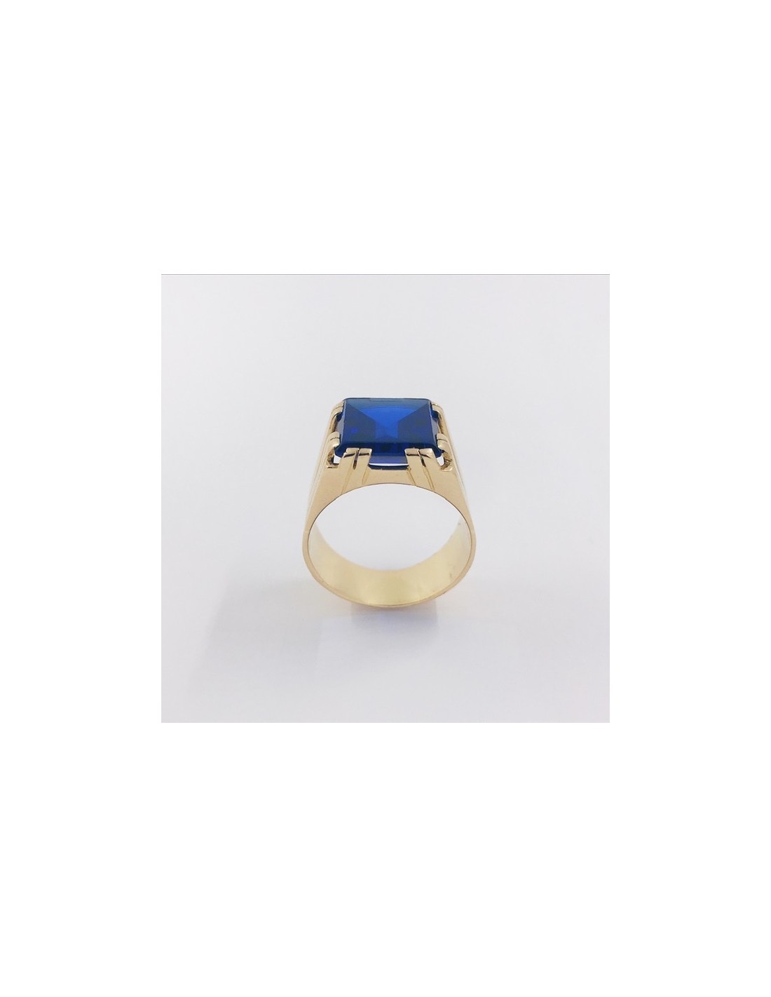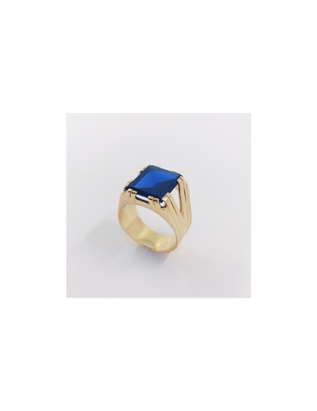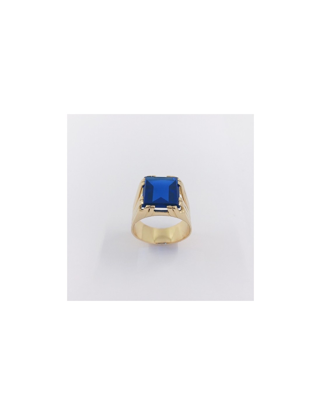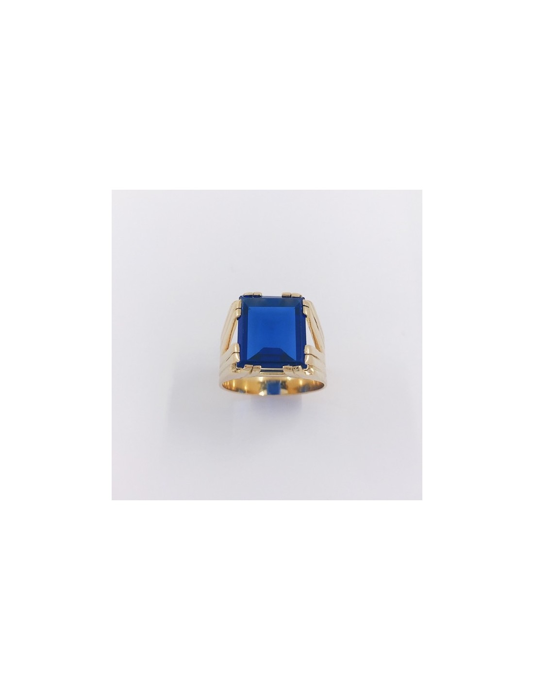 Precioso sello de segunda mano en oro amarillo de primera ley con piedra azul central. Con un diseño precioso y elegante, ideal para los amantes de sellos. Talla: 23. Peso: 11,36gr.