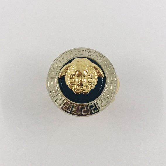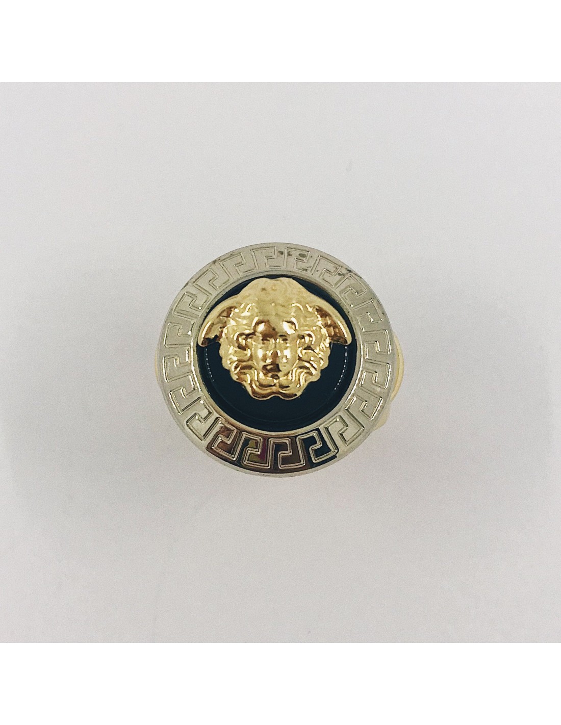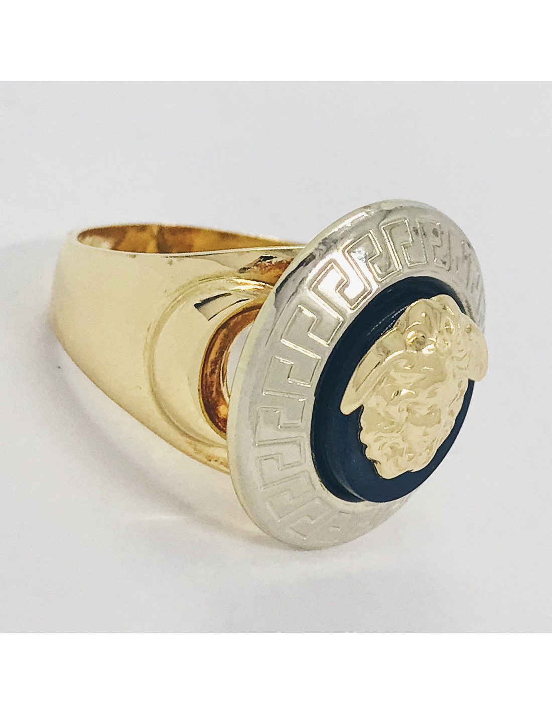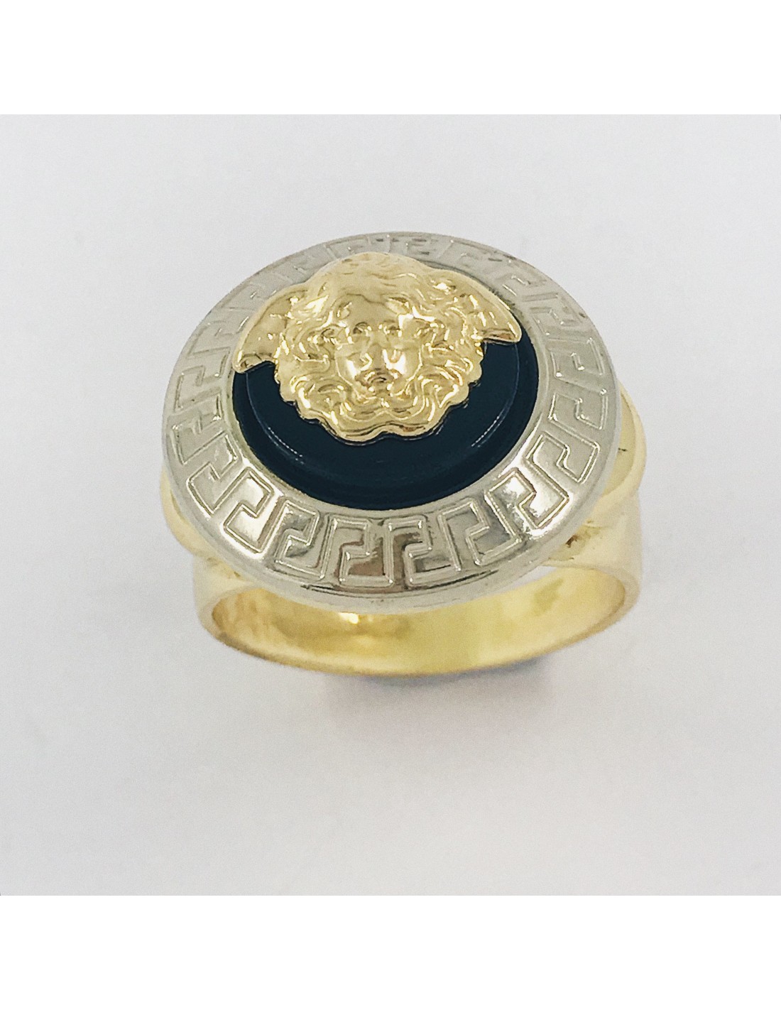 Fabuloso sello de segunda mano de oro bicolor, en amarillo y blanco con un ónix dividiendo el borde exterior y la caricatura central que guardan un parecido al estilo Versace. Peso: 8,6gr. Dedo: 17.