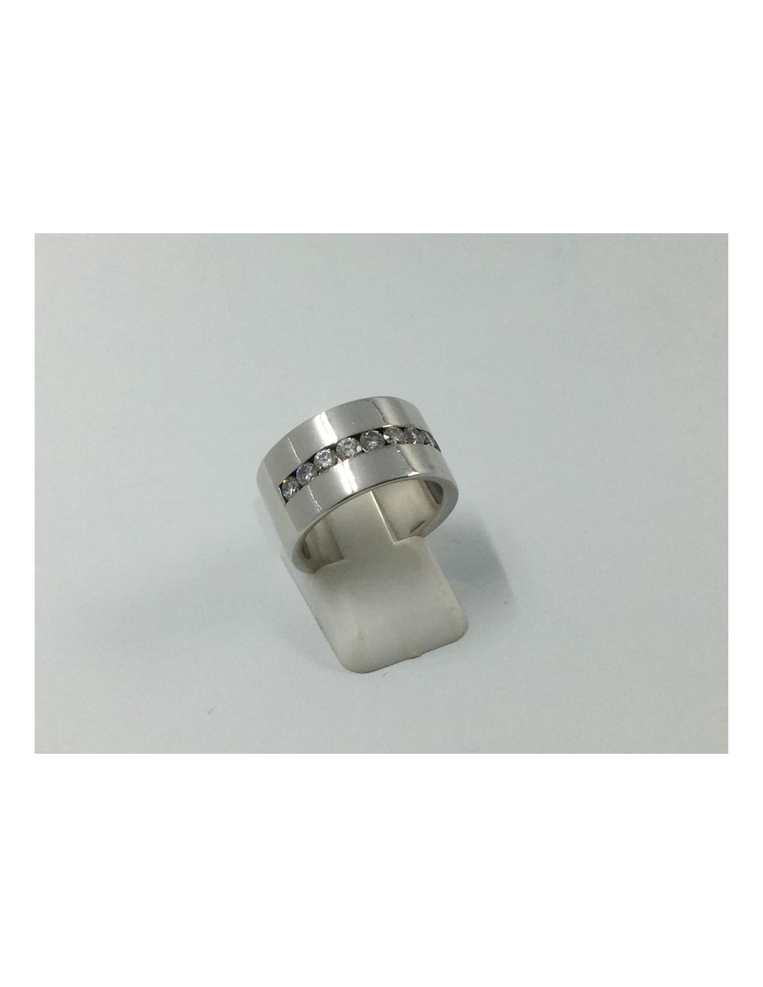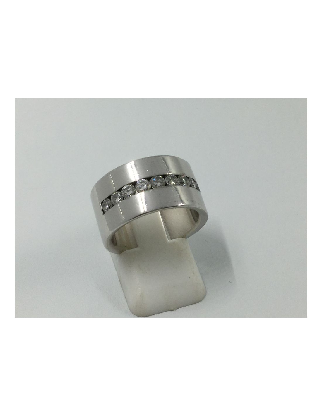 Anillo ancho de segunda mano en oro blanco de 18 kt. y carril central con 9 brillantes de aprox. 0,05 qt. cada uno. Talla: 13. Peso total brillantes: 0,45 qt. aprox. Peso: 18,3 gr.