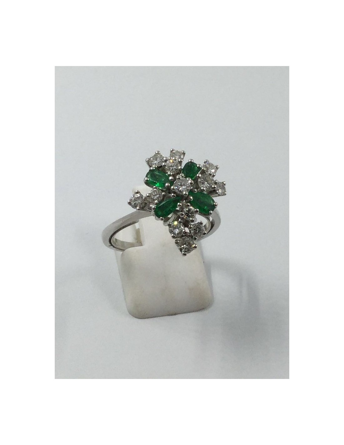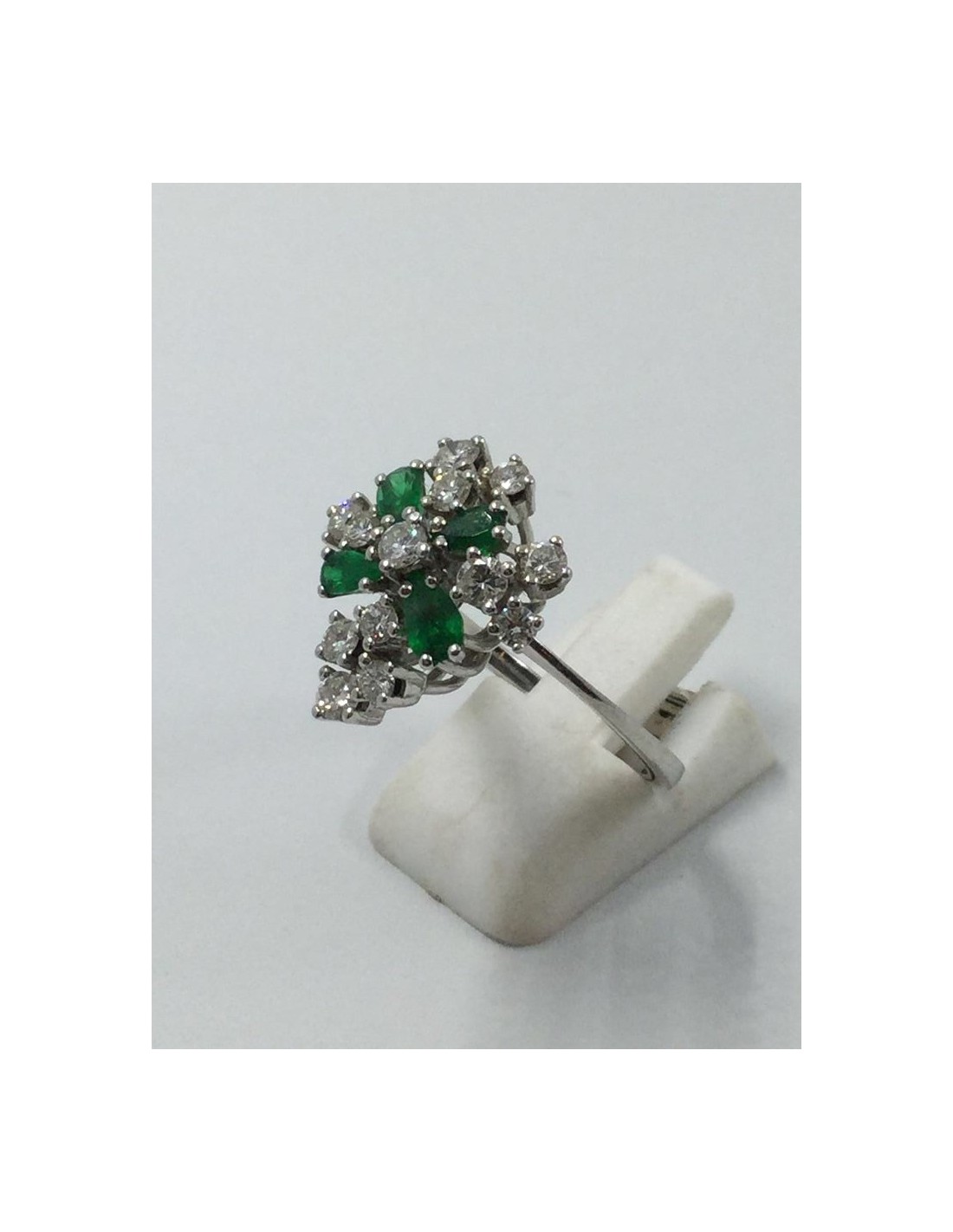 Anillo de segunda mano en oro blanco de 18 kt , 13 brillantes y 4 esmeraldas. Talla: 17. Peso: 5,9 gr.
