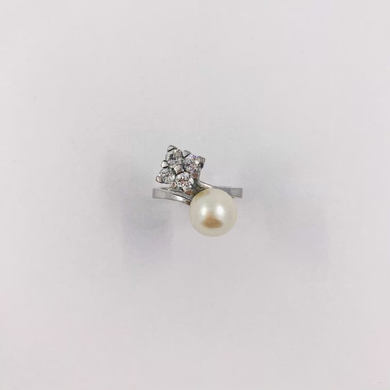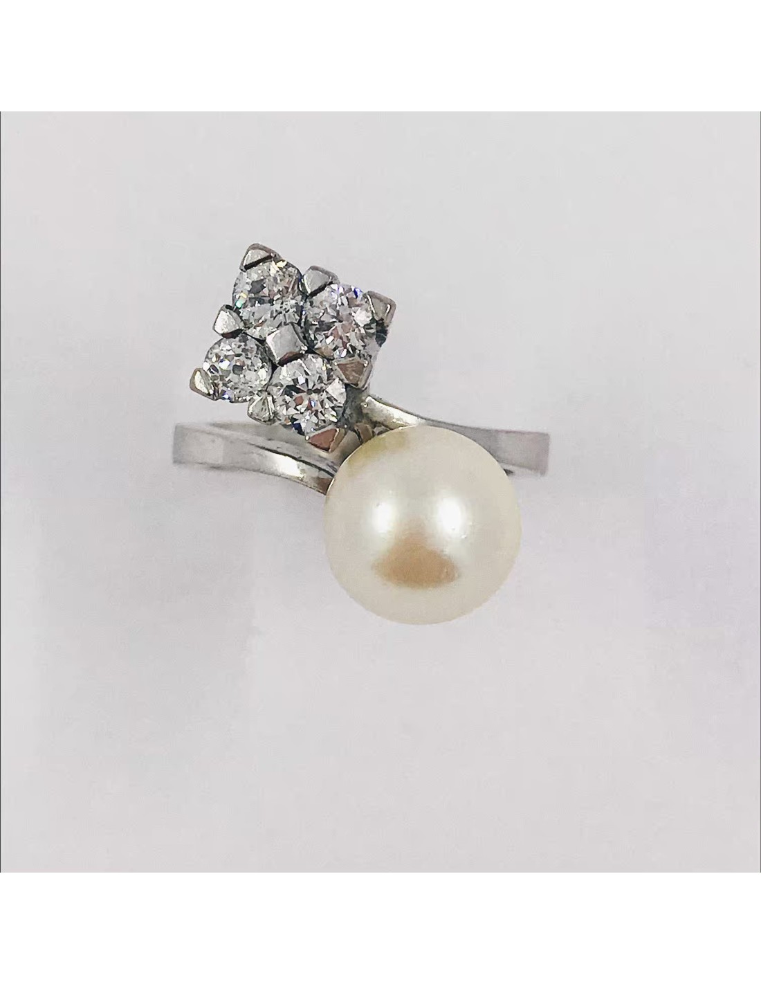 Anillo en oro blanco con perla cultivada y cuadrado de brillantes