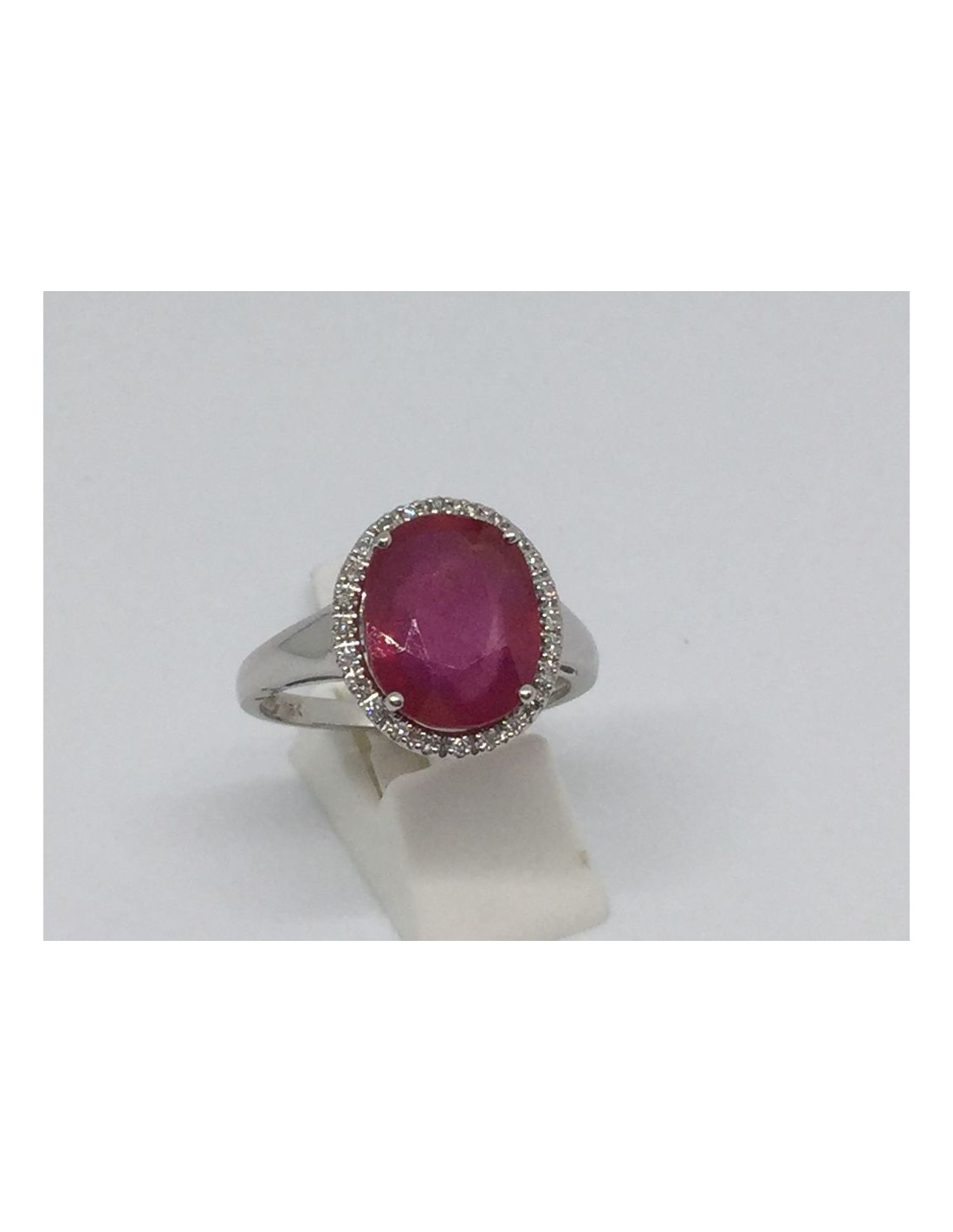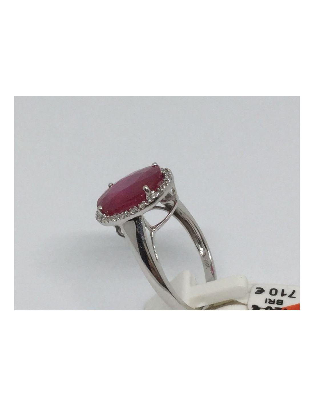 Sortija en oro blanco con piedra de color rodeada de brillantes