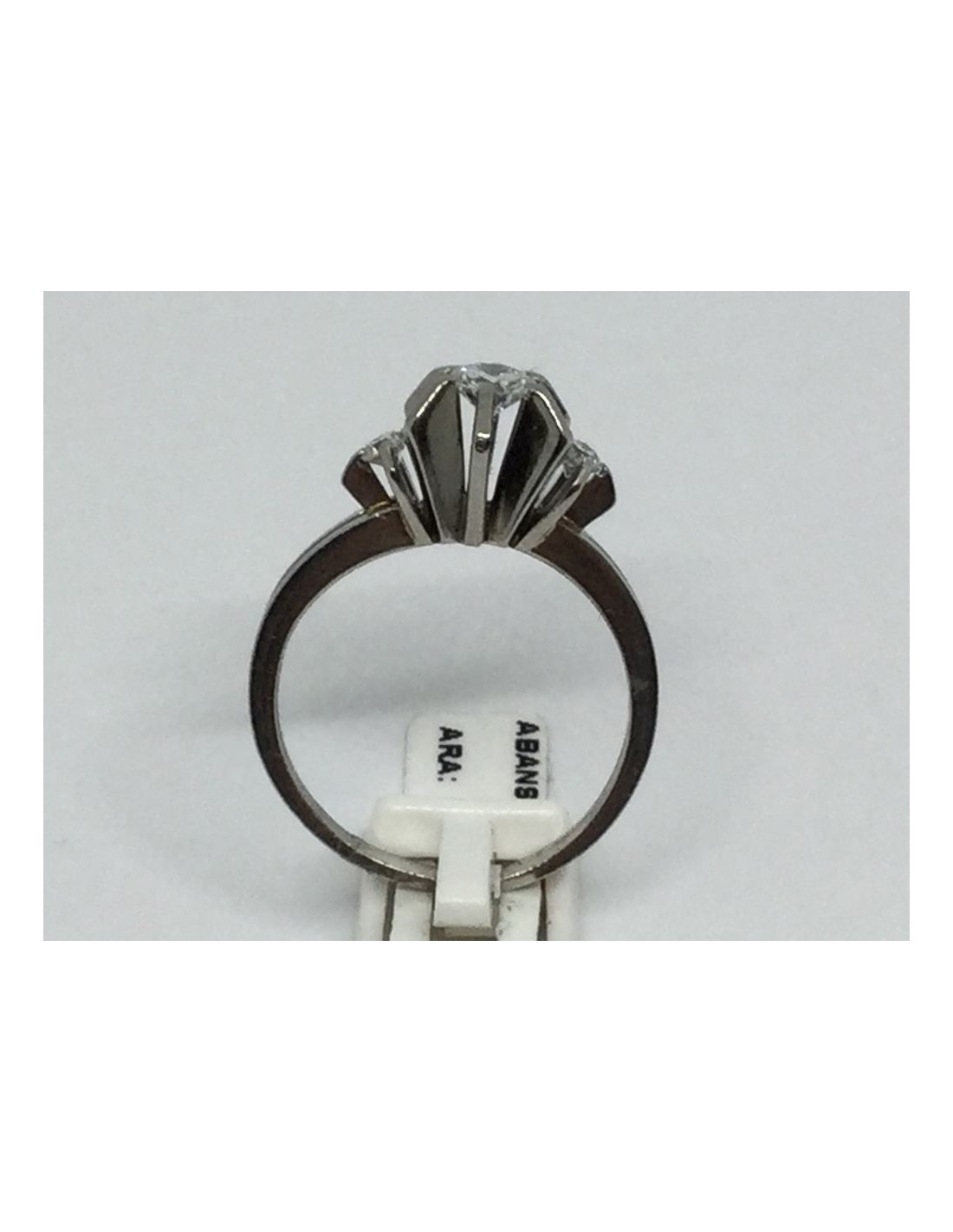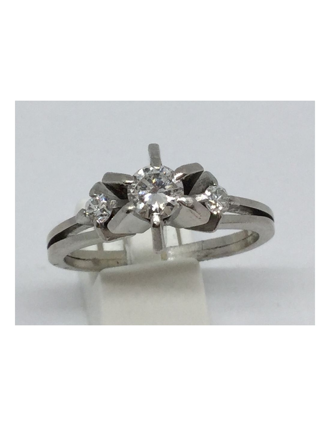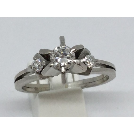 Sortija solitario de ocasión en oro blanco de 18 kt. y brillante central de 0,25 qt. flanqueado por dos brillantes. Talla: 17. Peso: 6,3 gr.