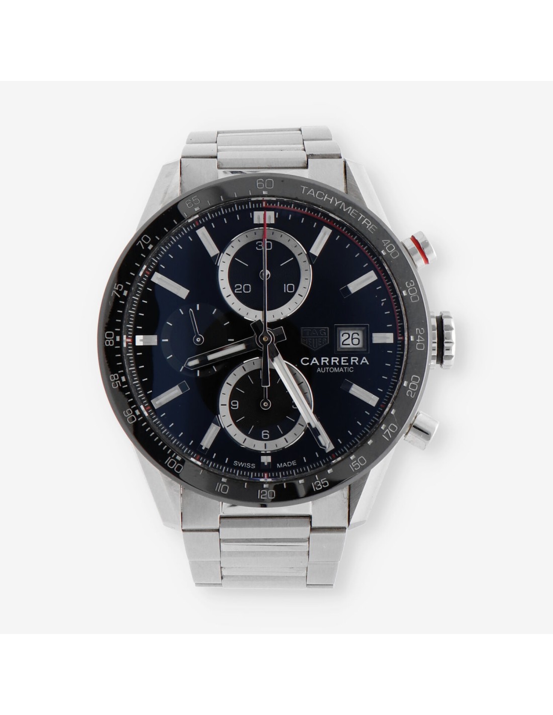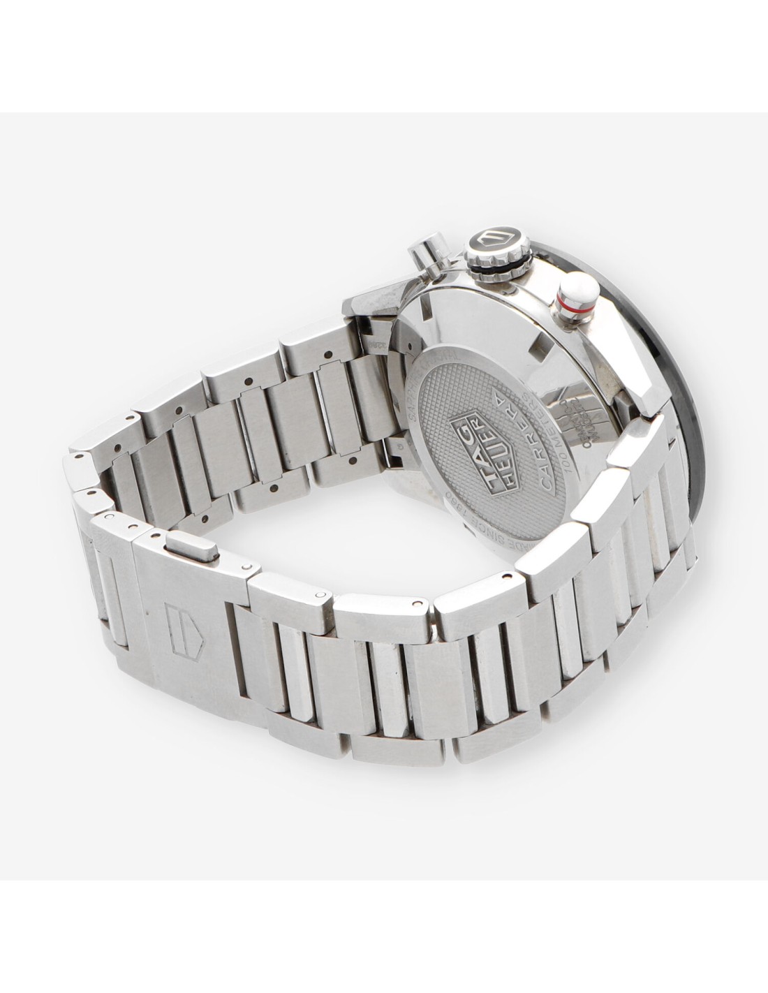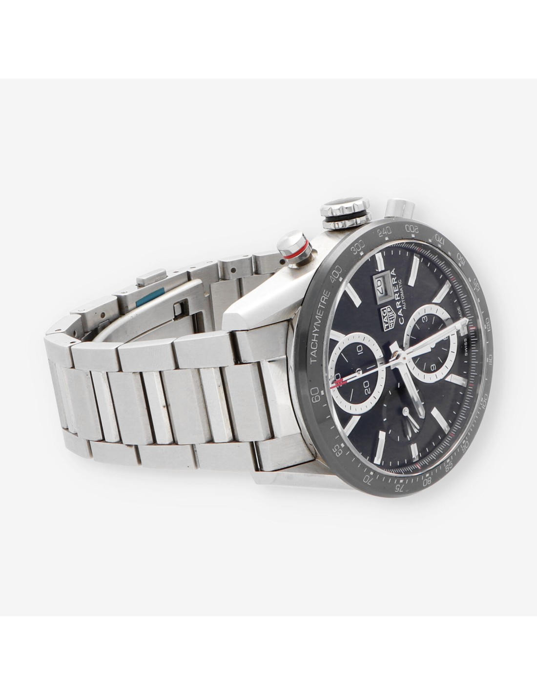 Excelente Carrera del calibre 16 de segunda mano en perfecto estado de marcha y conservación.  Cuerda automática con una reserva de marchas de 42h. Caja en acero 41mm con cristal zafiro fondo en negro y sin cifras. Segundero a las 9, minutero del cronógrafo a las 12 y a las 6 está situado el horario del cronografo. Resistencia al agua de 10ATM y bisel cerámico. Correa  acero y cierre en acero.