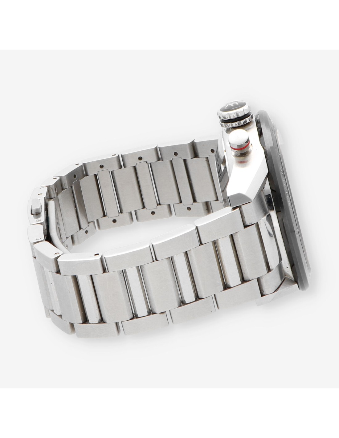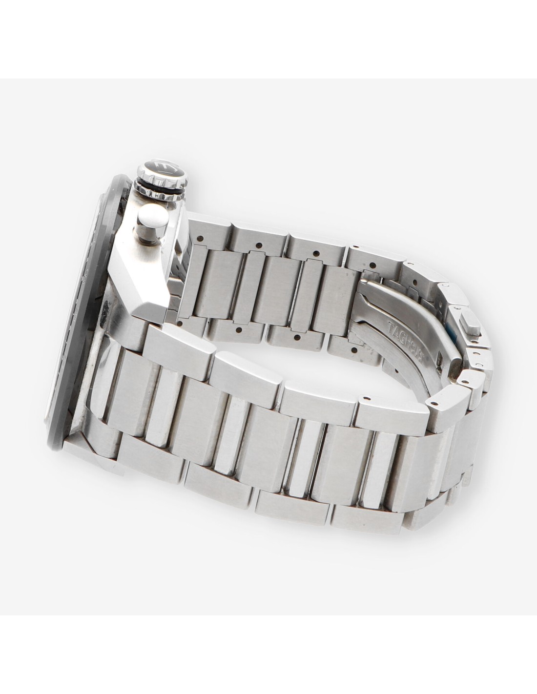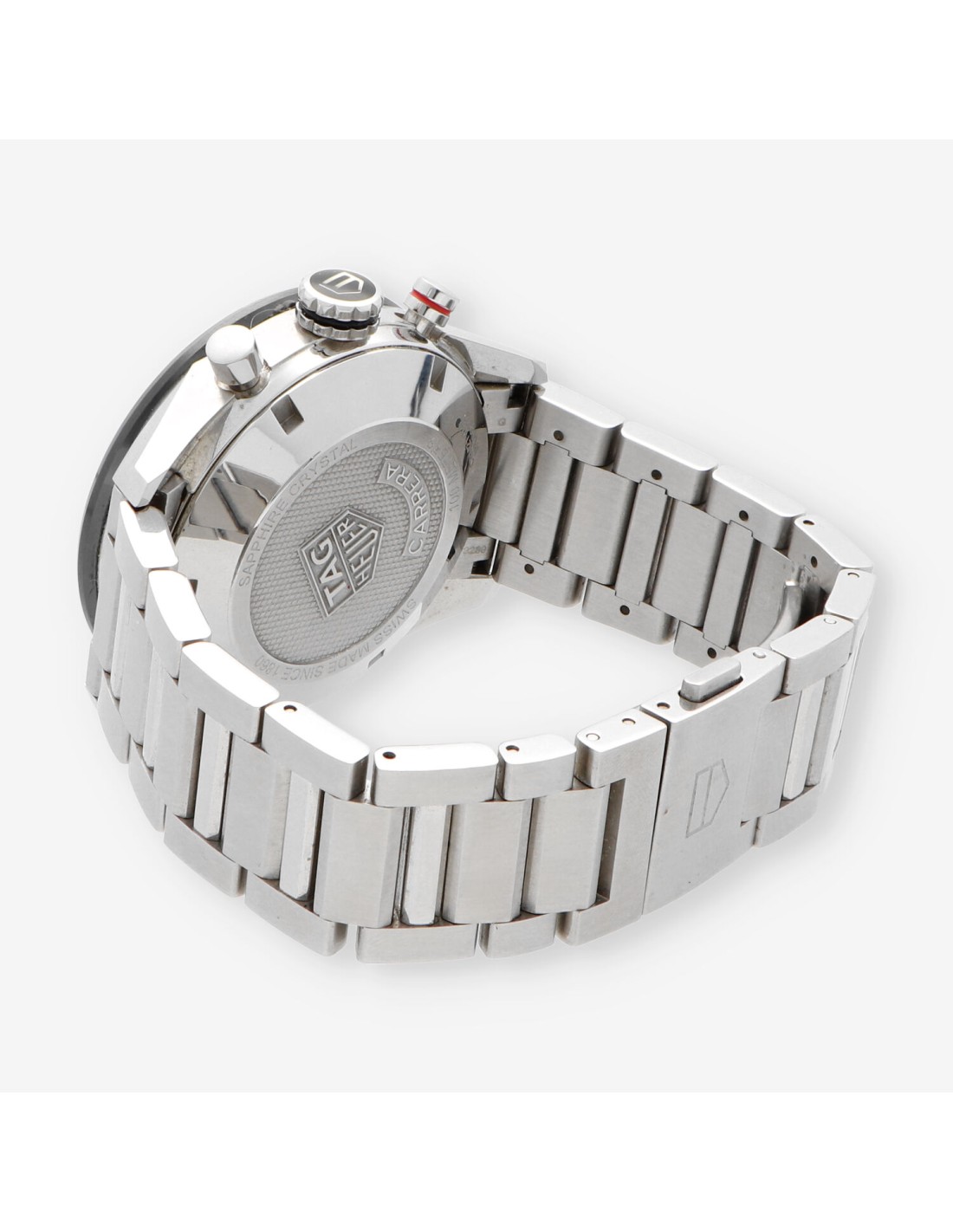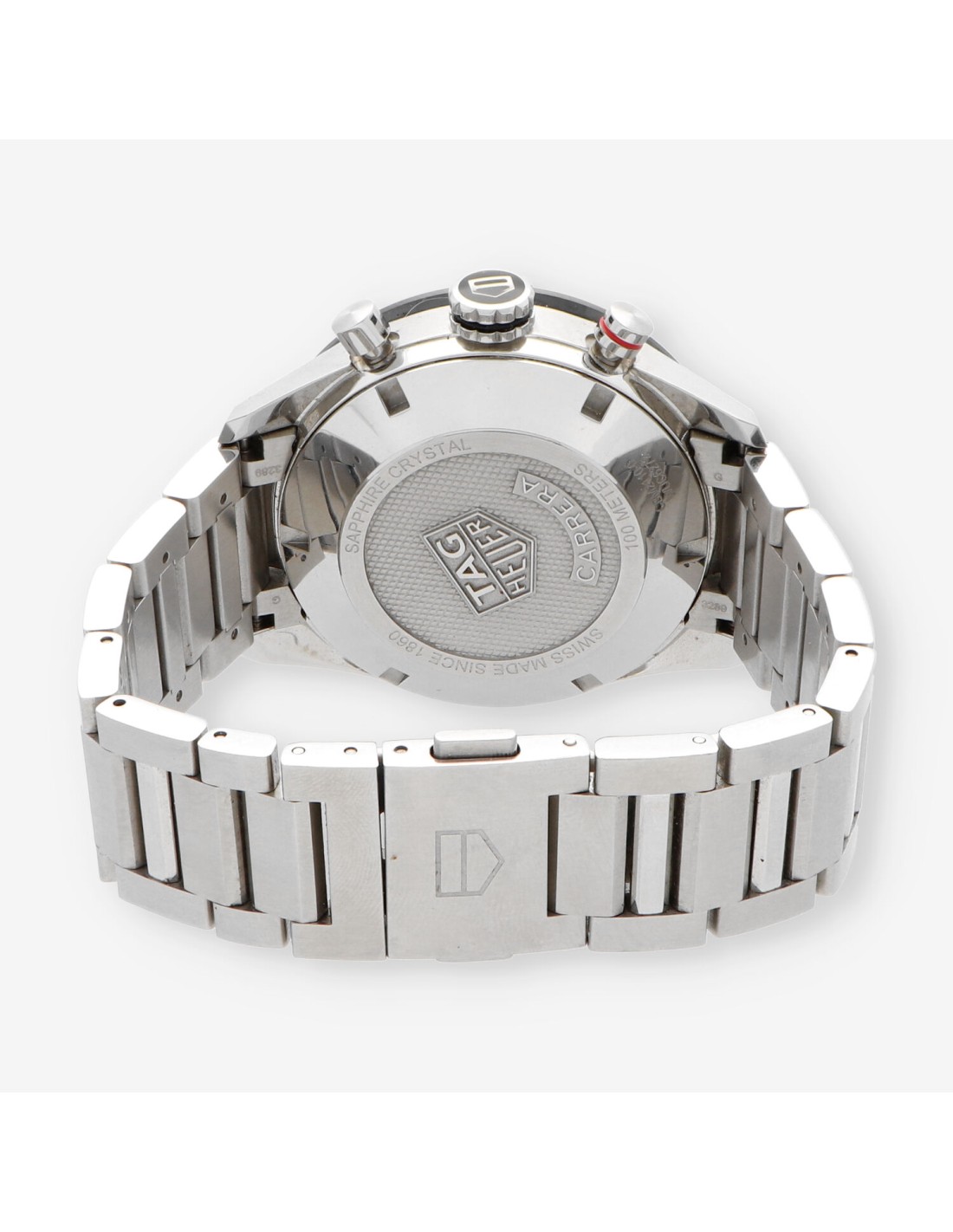 Excelente Carrera del calibre 16 de segunda mano en perfecto estado de marcha y conservación.  Cuerda automática con una reserva de marchas de 42h. Caja en acero 41mm con cristal zafiro fondo en negro y sin cifras. Segundero a las 9, minutero del cronógrafo a las 12 y a las 6 está situado el horario del cronografo. Resistencia al agua de 10ATM y bisel cerámico. Correa  acero y cierre en acero.